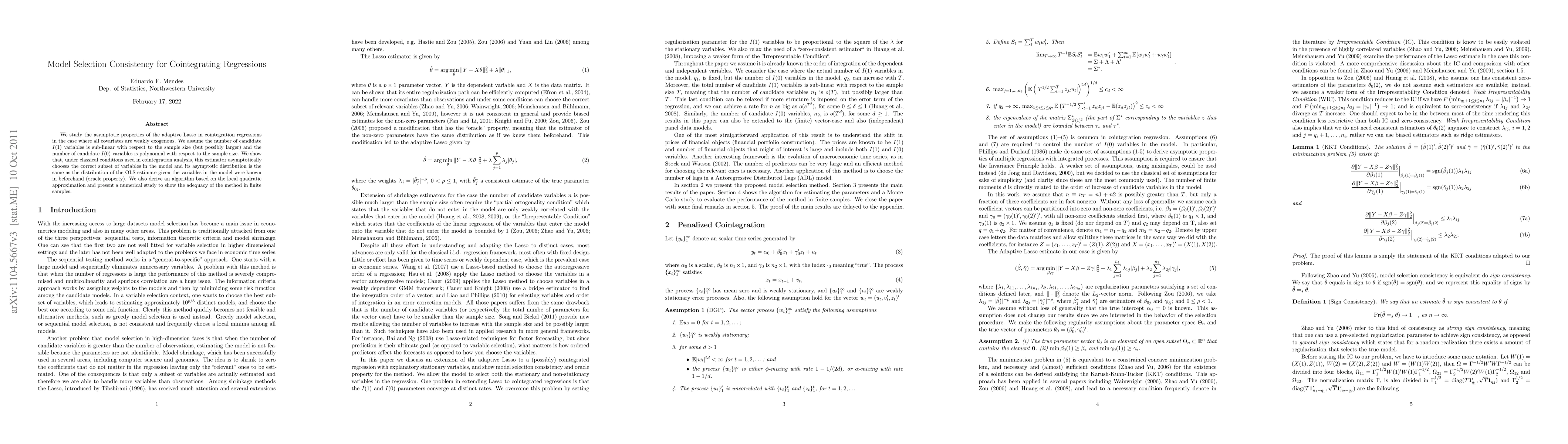 A study on cointegration regressions finds that the adaptive Lasso estimator consistently selects the correct subset of variables under classical conditions, with an asymptotic distribution similar to OLS estimates if the model variables were known in advance.