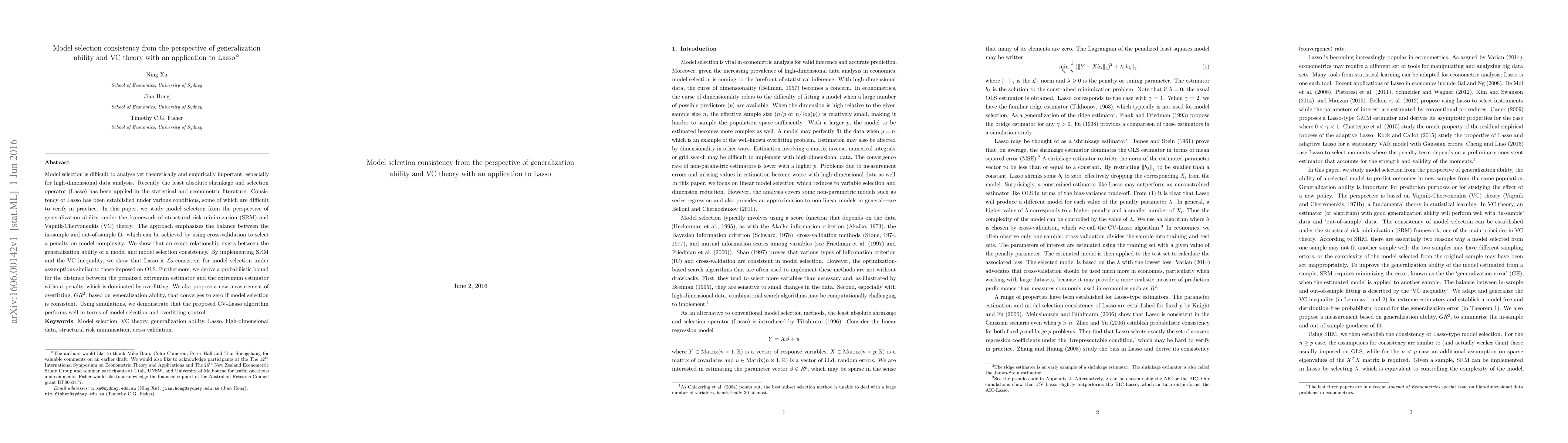 This paper explores model selection consistency through the lens of generalization ability and VC theory, focusing on Lasso. It demonstrates that Lasso achieves L2-consistency under conditions similar to OLS, and introduces a new overfitting measure, GR2, which converges to zero with consistent model selection. Simulation results show the proposed CV-Lasso algorithm effectively balances model selection and overfitting control.
