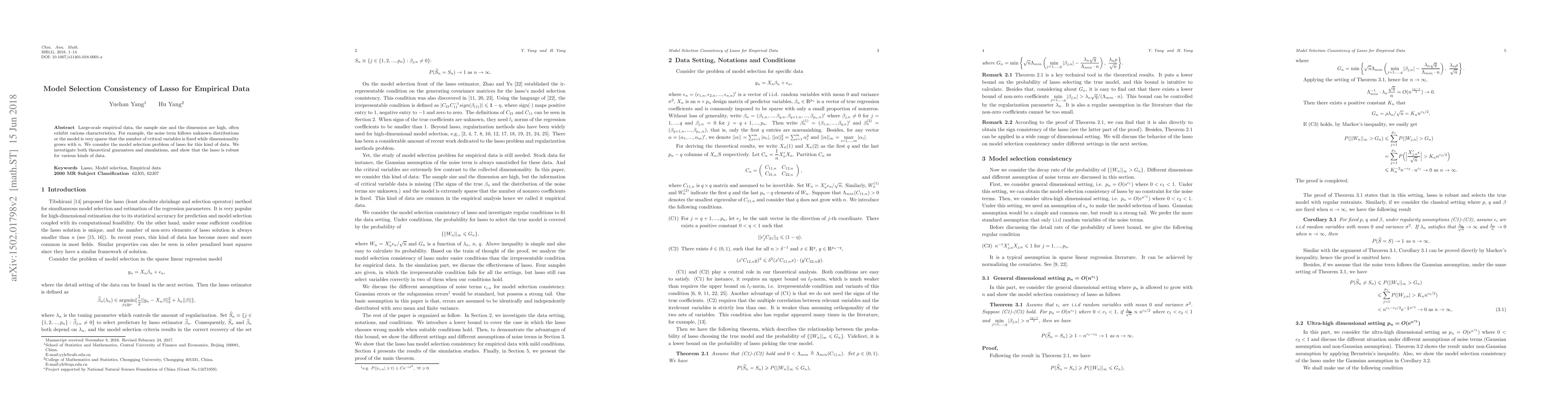 Large-scale empirical data, the sample size and the dimension are high, often exhibit various characteristics. For example, the noise term follows unknown distributions or the model is very sparse that the number of critical variables is fixed while dimensionality grows with $n$. We consider the model selection problem of lasso for this kind of data. We investigate both theoretical guarantees and simulations, and show that the lasso is robust for various kinds of data.