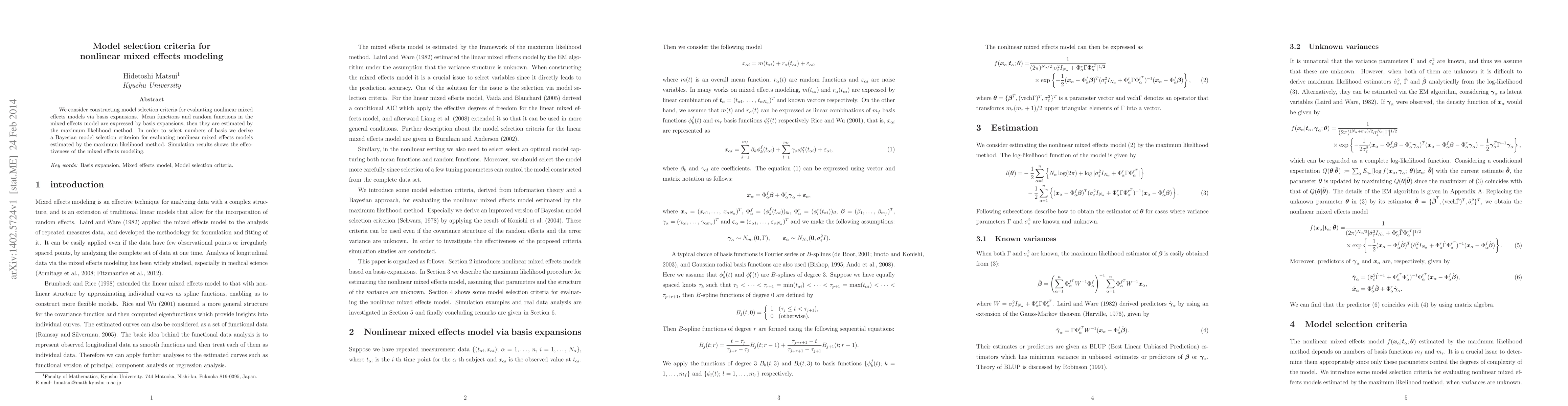 This paper develops a Bayesian model selection criterion for nonlinear mixed effects models expressed via basis expansions, estimating mean and random functions using maximum likelihood. Simulation results demonstrate the effectiveness of the proposed model selection approach.