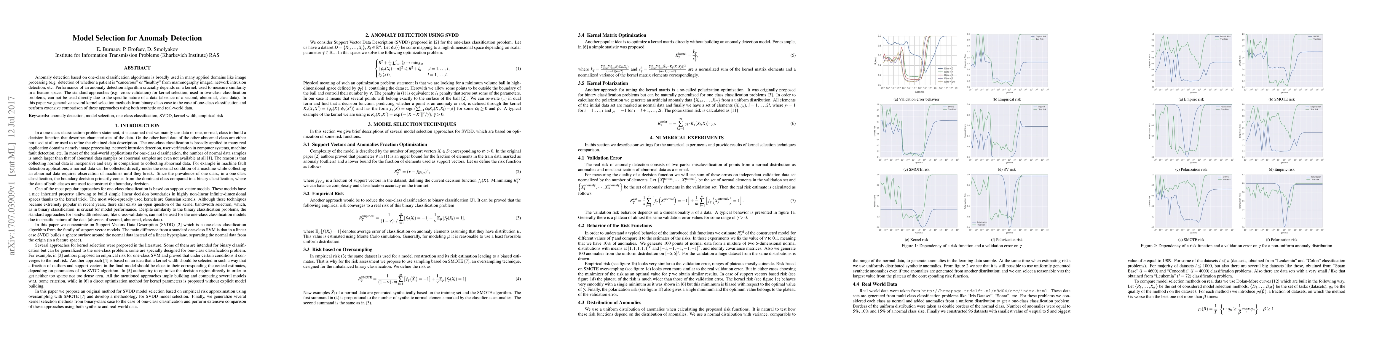 Anomaly detection based on one-class classification algorithms is broadly used in many applied domains like image processing (e.g. detection of whether a patient is "cancerous" or "healthy" from mammography image), network intrusion detection, etc. Performance of an anomaly detection algorithm crucially depends on a kernel, used to measure similarity in a feature space. The standard approaches (e.g. cross-validation) for kernel selection, used in two-class classification problems, can not be used directly due to the specific nature of a data (absence of a second, abnormal, class data). In this paper we generalize several kernel selection methods from binary-class case to the case of one-class classification and perform extensive comparison of these approaches using both synthetic and real-world data.