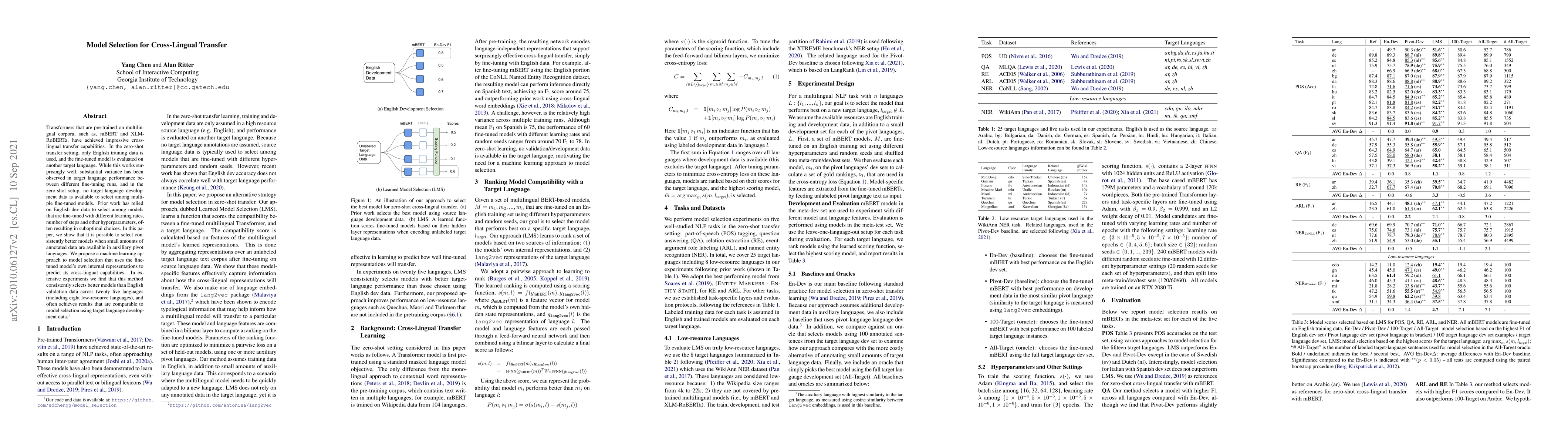 Transformers that are pre-trained on multilingual corpora, such as, mBERT and XLM-RoBERTa, have achieved impressive cross-lingual transfer capabilities. In the zero-shot transfer setting, only English training data is used, and the fine-tuned model is evaluated on another target language. While this works surprisingly well, substantial variance has been observed in target language performance between different fine-tuning runs, and in the zero-shot setup, no target-language development data is available to select among multiple fine-tuned models. Prior work has relied on English dev data to select among models that are fine-tuned with different learning rates, number of steps and other hyperparameters, often resulting in suboptimal choices. In this paper, we show that it is possible to select consistently better models when small amounts of annotated data are available in auxiliary pivot languages. We propose a machine learning approach to model selection that uses the fine-tuned model's own internal representations to predict its cross-lingual capabilities. In extensive experiments we find that this method consistently selects better models than English validation data across twenty five languages (including eight low-resource languages), and often achieves results that are comparable to model selection using target language development data.