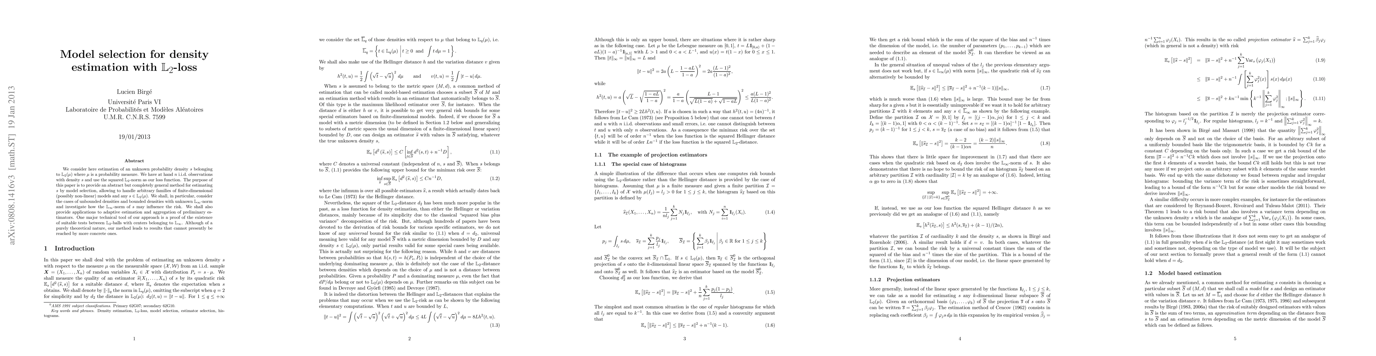 We consider here estimation of an unknown probability density s belonging to L2(mu) where mu is a probability measure. We have at hand n i.i.d. observations with density s and use the squared L2-norm as our loss function. The purpose of this paper is to provide an abstract but completely general method for estimating s by model selection, allowing to handle arbitrary families of finite-dimensional (possibly non-linear) models and any density s belonging to L2(mu). We shall, in particular, consider the cases of unbounded densities and bounded densities with unknown bound and investigate how the L-infinity-norm of s may influence the risk. We shall also provide applications to adaptive estimation and aggregation of preliminary estimators. Although of a purely theoretical nature, our method leads to results that cannot presently be reached by more concrete methods.