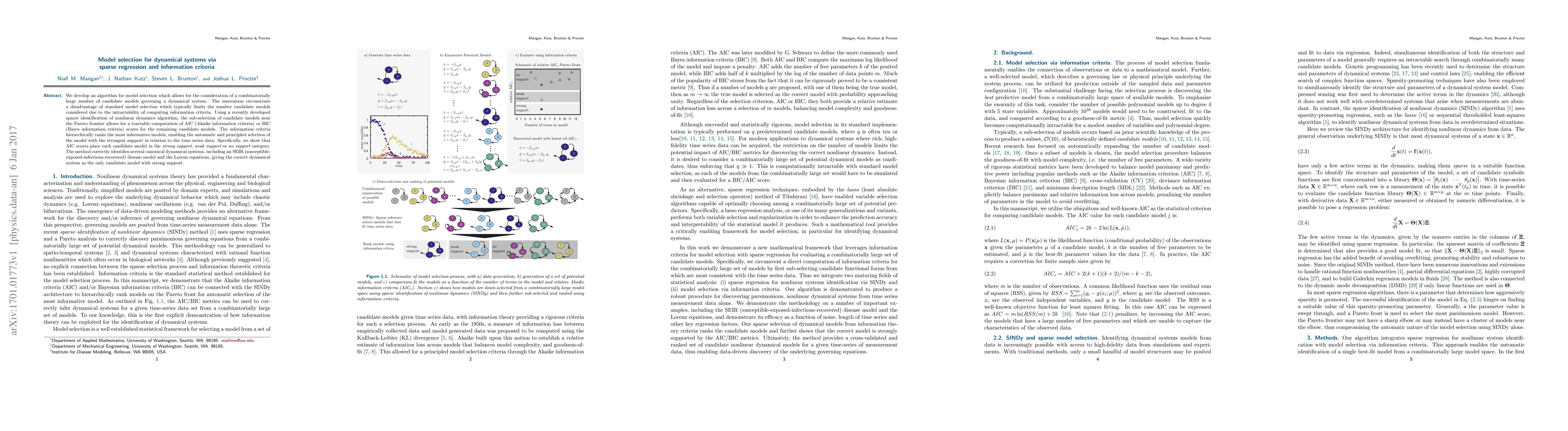 We develop an algorithm for model selection which allows for the consideration of a combinatorially large number of candidate models governing a dynamical system. The innovation circumvents a disadvantage of standard model selection which typically limits the number candidate models considered due to the intractability of computing information criteria. Using a recently developed sparse identification of nonlinear dynamics algorithm, the sub-selection of candidate models near the Pareto frontier allows for a tractable computation of AIC (Akaike information criteria) or BIC (Bayes information criteria) scores for the remaining candidate models. The information criteria hierarchically ranks the most informative models, enabling the automatic and principled selection of the model with the strongest support in relation to the time series data. Specifically, we show that AIC scores place each candidate model in the {\em strong support}, {\em weak support} or {\em no support} category. The method correctly identifies several canonical dynamical systems, including an SEIR (susceptible-exposed-infectious-recovered) disease model and the Lorenz equations, giving the correct dynamical system as the only candidate model with strong support.