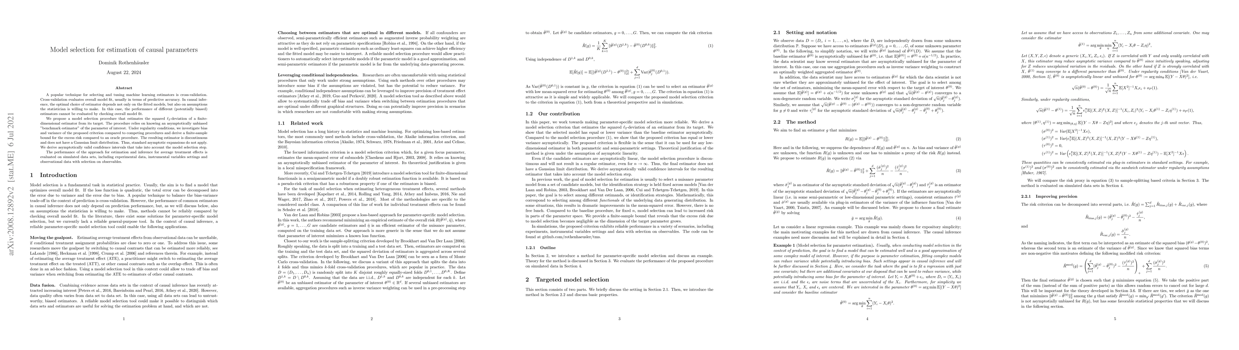 A new model selection procedure is proposed to estimate causal parameters, taking into account assumptions made by the statistician, and its performance is evaluated on simulated data sets, including experimental and observational data.