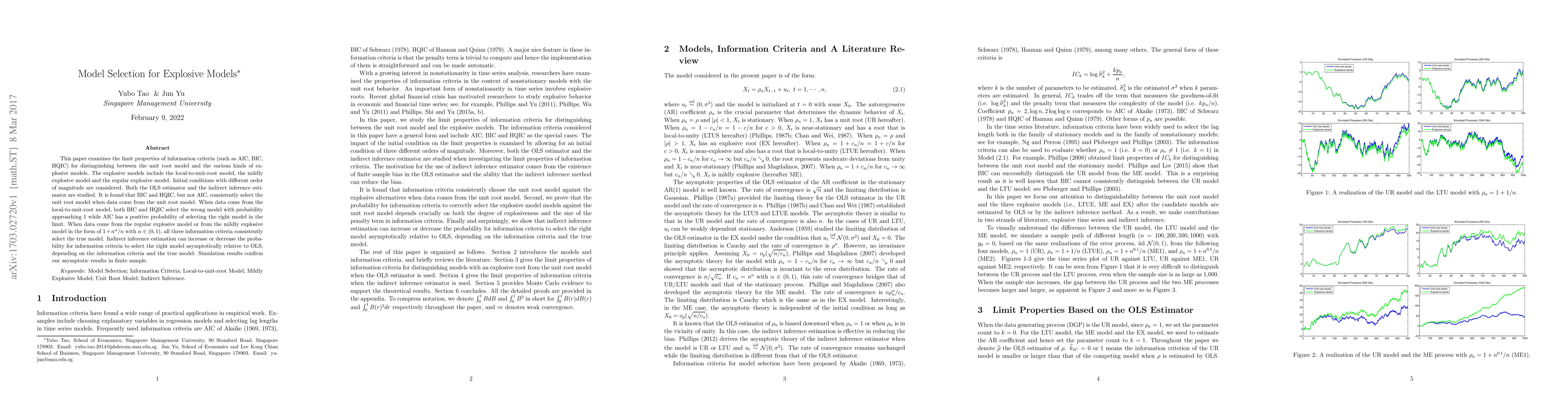 This paper investigates the performance of information criteria (AIC, BIC, HQIC) in distinguishing between unit root and various explosive models. It finds that while BIC and HQIC consistently select the unit root model, AIC has a higher chance of selecting the correct model when data follow a local-to-unit-root process. All criteria correctly identify explosive models in the limit.