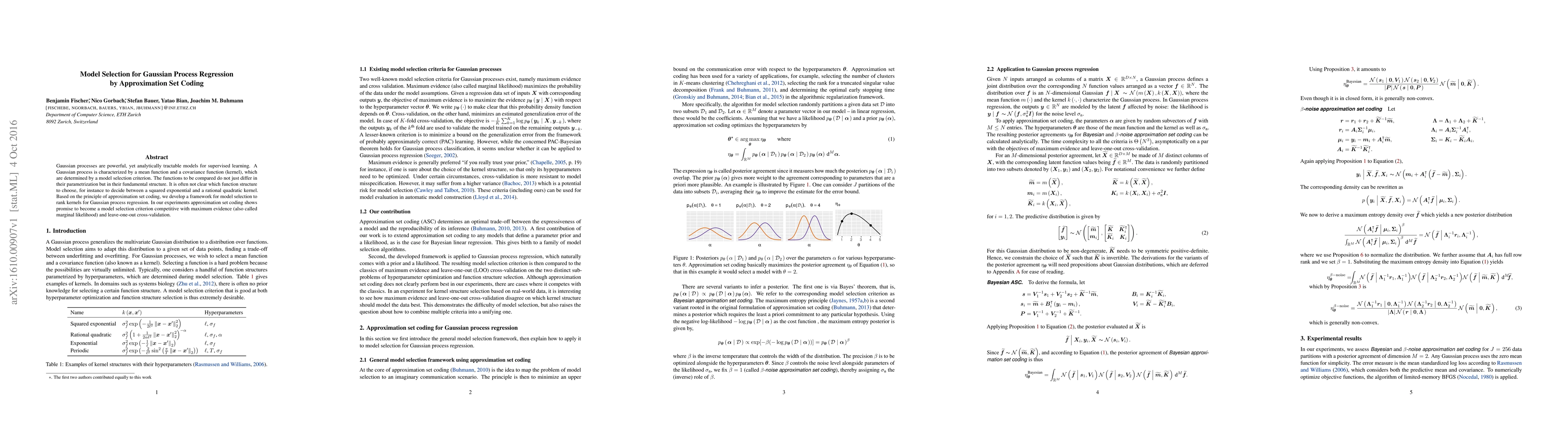 Gaussian processes are powerful, yet analytically tractable models for supervised learning. A Gaussian process is characterized by a mean function and a covariance function (kernel), which are determined by a model selection criterion. The functions to be compared do not just differ in their parametrization but in their fundamental structure. It is often not clear which function structure to choose, for instance to decide between a squared exponential and a rational quadratic kernel. Based on the principle of approximation set coding, we develop a framework for model selection to rank kernels for Gaussian process regression. In our experiments approximation set coding shows promise to become a model selection criterion competitive with maximum evidence (also called marginal likelihood) and leave-one-out cross-validation.
