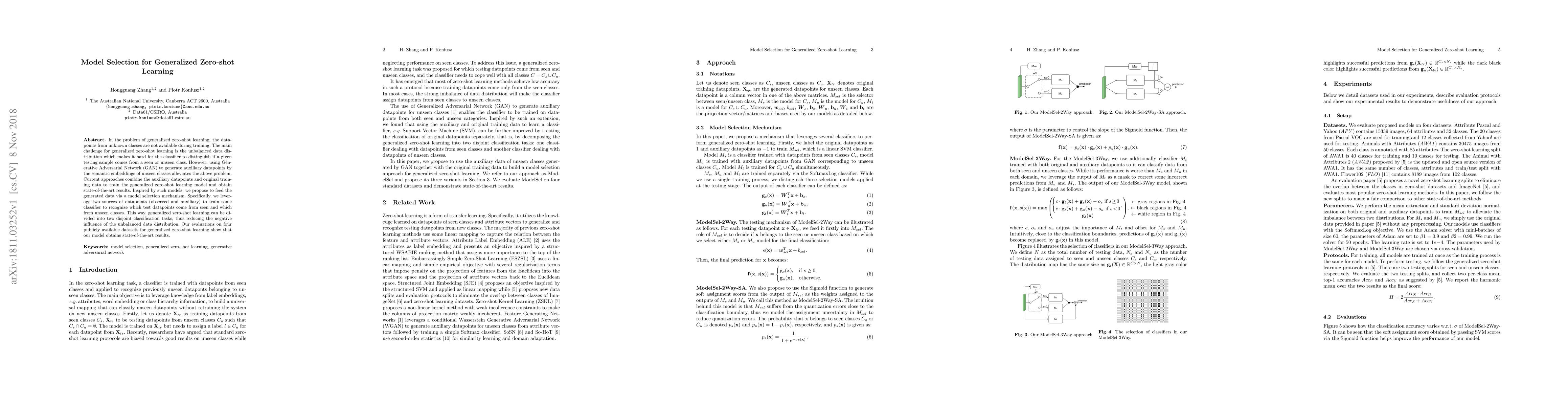 This paper proposes a model selection mechanism to improve generalized zero-shot learning by dividing it into two classification tasks using both observed and generated data. The approach leverages Generative Adversarial Networks to create auxiliary data, achieving state-of-the-art results on four datasets.
