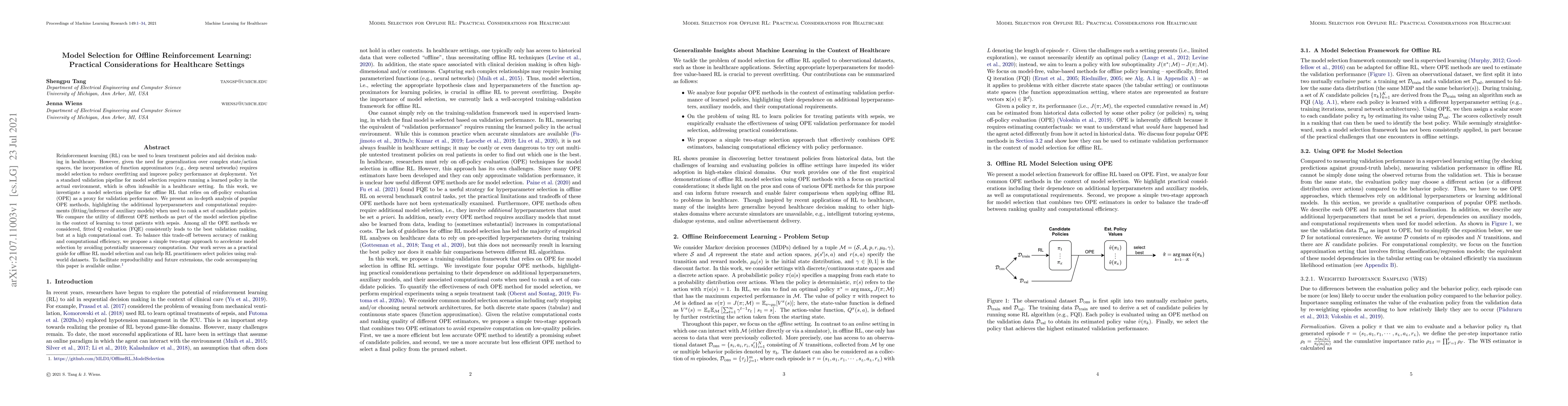 This research paper presents a model selection pipeline for offline reinforcement learning in healthcare settings that balances accuracy with computational efficiency, finding fitted Q evaluation to be the most accurate method at high cost.
