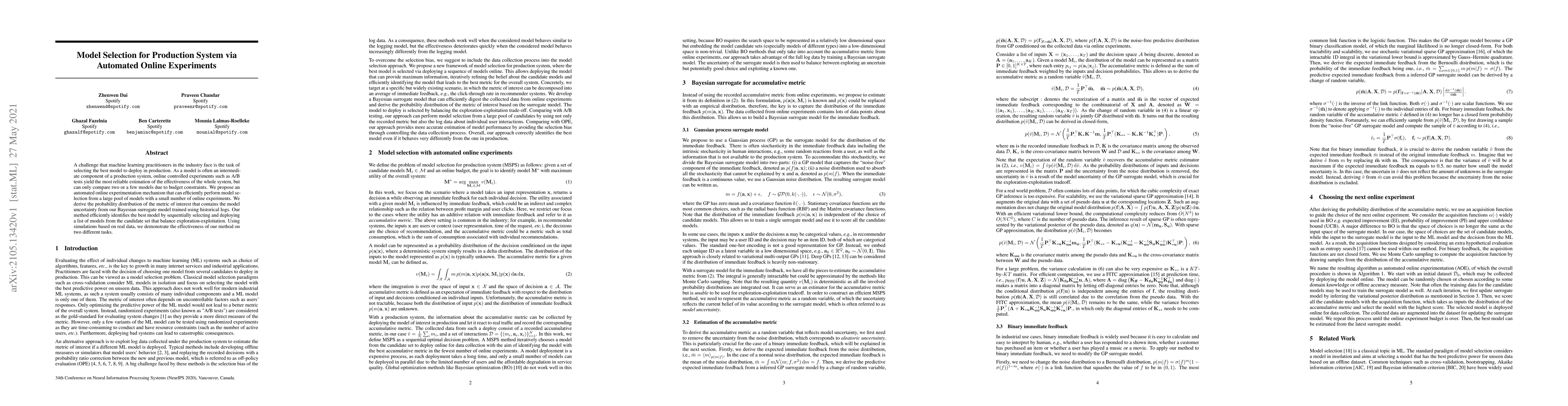 A challenge that machine learning practitioners in the industry face is the task of selecting the best model to deploy in production. As a model is often an intermediate component of a production system, online controlled experiments such as A/B tests yield the most reliable estimation of the effectiveness of the whole system, but can only compare two or a few models due to budget constraints. We propose an automated online experimentation mechanism that can efficiently perform model selection from a large pool of models with a small number of online experiments. We derive the probability distribution of the metric of interest that contains the model uncertainty from our Bayesian surrogate model trained using historical logs. Our method efficiently identifies the best model by sequentially selecting and deploying a list of models from the candidate set that balance exploration-exploitation. Using simulations based on real data, we demonstrate the effectiveness of our method on two different tasks.