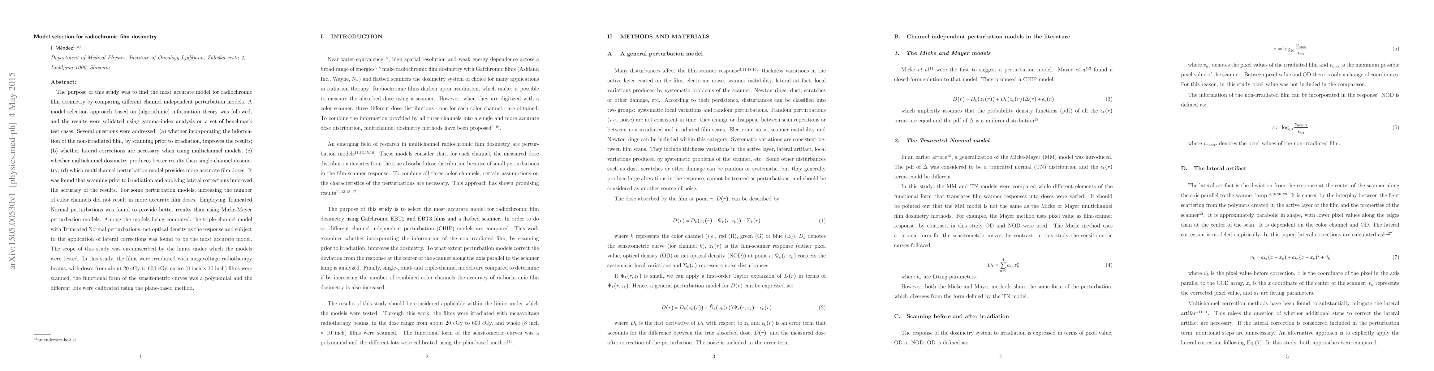 The purpose of this study was to find the most accurate model for radiochromic film dosimetry by comparing different channel independent perturbation models. A model selection approach based on (algorithmic) information theory was followed, and the results were validated using gamma-index analysis on a set of benchmark test cases. Several questions were addressed: (a) whether incorporating the information of the non-irradiated film, by scanning prior to irradiation, improves the results; (b) whether lateral corrections are necessary when using multichannel models; (c) whether multichannel dosimetry produces better results than single-channel dosimetry; (d) which multichannel perturbation model provides more accurate film doses. It was found that scanning prior to irradiation and applying lateral corrections improved the accuracy of the results. For some perturbation models, increasing the number of color channels did not result in more accurate film doses. Employing Truncated Normal perturbations was found to provide better results than using Micke-Mayer perturbation models.} Among the models being compared, the triple-channel model with Truncated Normal perturbations, net optical density as the response and subject to the application of lateral corrections was found to be the most accurate model. The scope of this study was circumscribed by the limits under which the models were tested. In this study, the films were irradiated with megavoltage radiotherapy beams, with doses from about 20 cGy to 600 cGy, entire (8 ${\rm inch}$ $\times$ 10 ${\rm inch}$) films were scanned, the functional form of the sensitometric curves was a polynomial and the different lots were calibrated using the plane-based method.