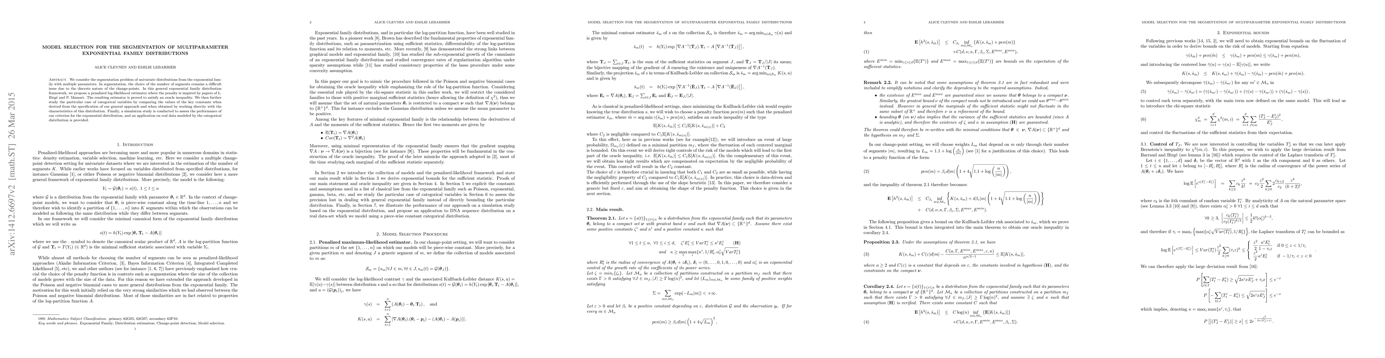 We consider the segmentation problem of univariate distributions from the exponential family with multiple parameters. In segmentation, the choice of the number of segments remains a difficult issue due to the discrete nature of the change-points. In this general exponential family distribution framework, we propose a penalized log-likelihood estimator where the penalty is inspired by papers of L. Birg\'e and P. Massart. The resulting estimator is proved to satisfy an oracle inequality. We then further study the particular case of categorical variables by comparing the values of the key constants when derived from the specification of our general approach and when obtained by working directly with the characteristics of this distribution. Finally, a simulation study is conducted to assess the performance of our criterion for the exponential distribution, and an application on real data modelled by the categorical distribution is provided.