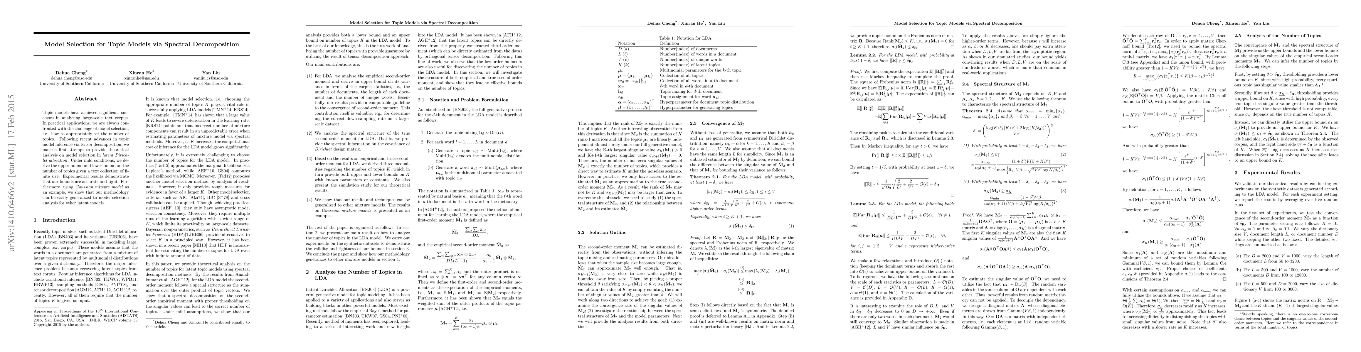 This paper proposes a theoretical framework for model selection in latent Dirichlet allocation using spectral decomposition, providing upper and lower bounds for the optimal number of topics. Experimental results show the accuracy of these bounds, and the methodology is demonstrated to be generalizable to other latent models like Gaussian mixture models.