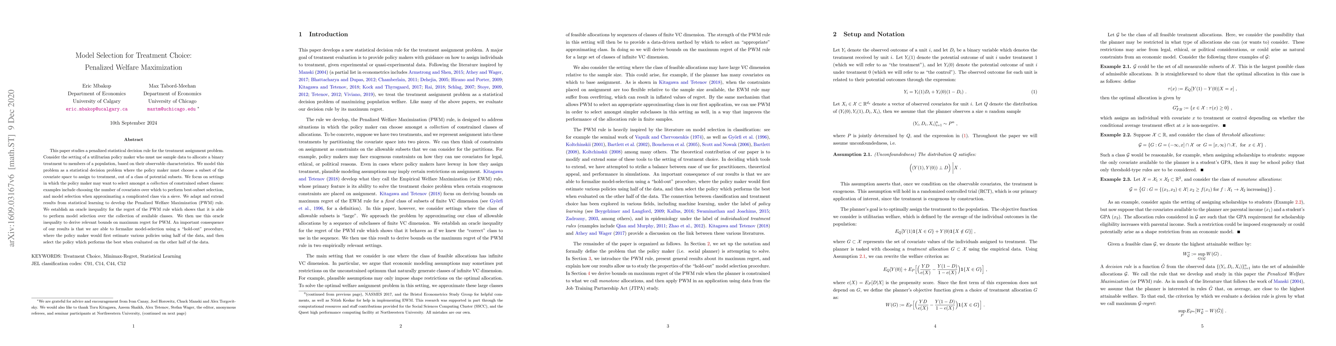 This paper develops a new statistical decision rule called Penalized Welfare Maximization that helps policymakers choose the best treatment plan based on sample data and observable characteristics. It establishes an oracle inequality for the regret of the rule, showing its ability to perform model selection over various classes of potential subsets.