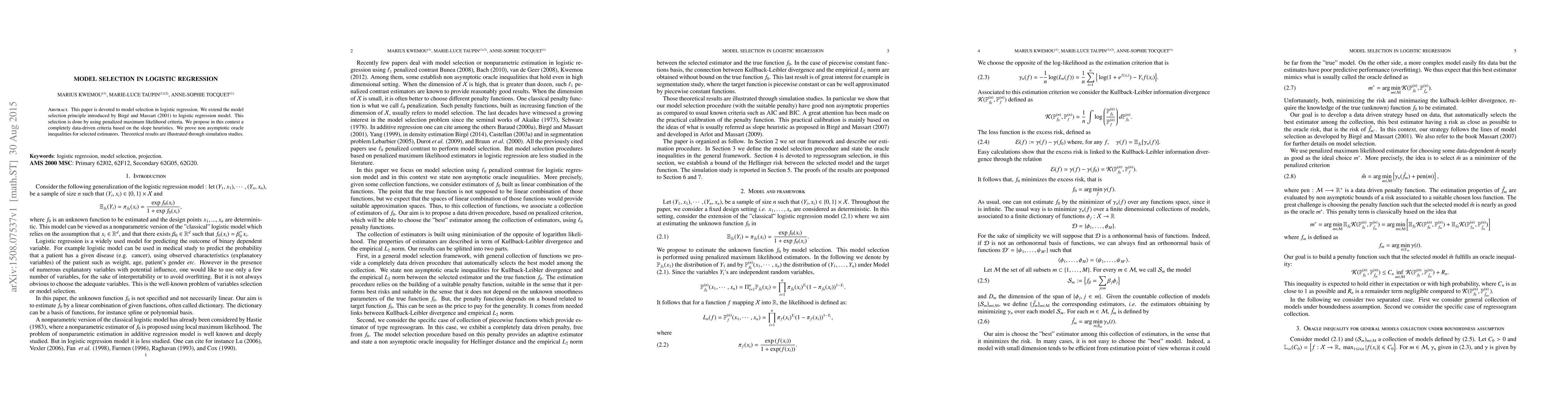 This paper extends the model selection principle for logistic regression using penalized maximum likelihood criteria, proposing a data-driven selection method based on slope heuristics. Theoretical results are supported by non-asymptotic oracle inequalities and simulation studies.