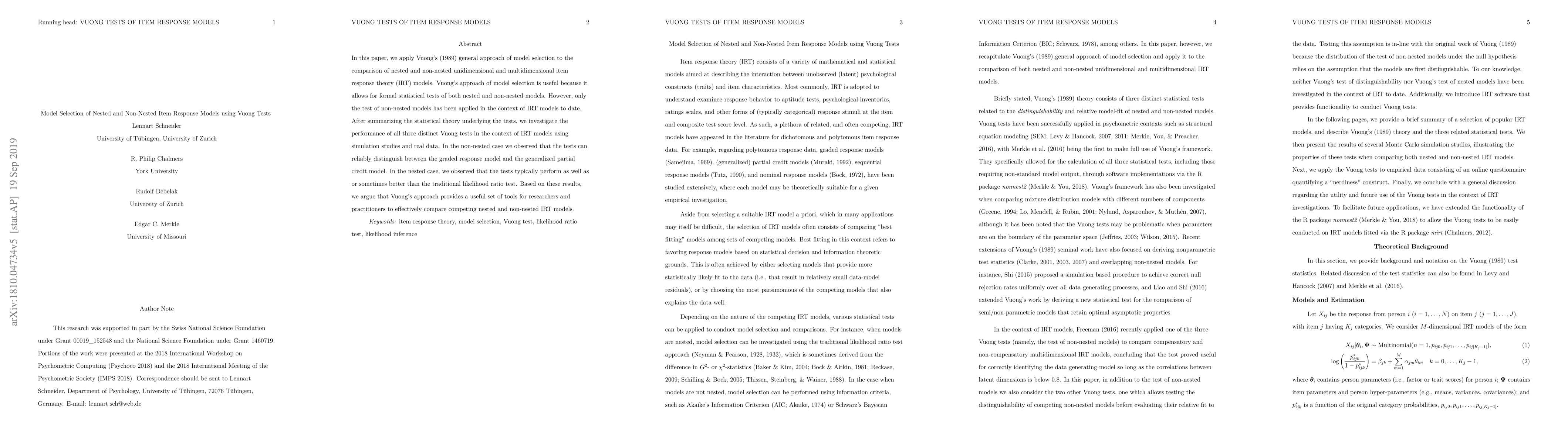 This paper applies Vuong's model selection approach to compare nested and non-nested item response theory models, demonstrating that Vuong tests can reliably distinguish between different IRT models and perform better than traditional methods in some cases. The study concludes that Vuong's approach offers valuable tools for effectively comparing competing IRT models.