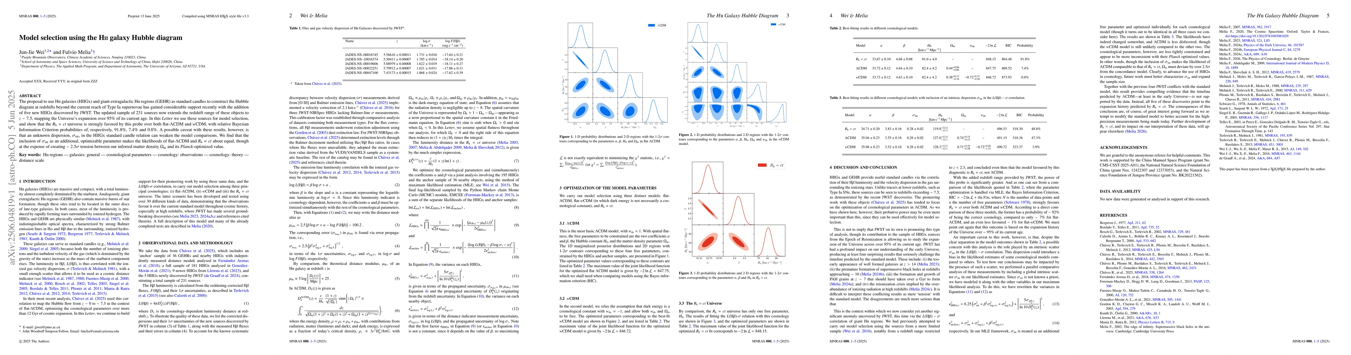 The proposal to use HII galaxies (HIIGx) and giant extragalactic HII regions (GEHR) as standard candles to construct the Hubble diagram at redshifts beyond the current reach of Type Ia supernovae has gained considerable support recently with the addition of five new HIIGx discovered by JWST. The updated sample of 231 sources now extends the redshift range of these objects to $z\sim 7.5$, mapping the Universe's expansion over $95\%$ of its current age. In this {\it Letter} we use these sources for model selection, and show that the $R_{\rm h}=ct$ universe is strongly favored by this probe over both flat-$\Lambda$CDM and $w$CDM, with relative Bayesian Information Criterion probabilities of, respectively, $91.8\%$, $7.4\%$ and $0.8\%$. A possible caveat with these results, however, is that an unknown dispersion, $\sigma_{\rm int}$, in the HIIGx standard candle relation can weaken the model comparisons. We find that the inclusion of $\sigma_{\rm int}$ as an additional, optimizable parameter makes the likelihoods of flat-$\Lambda$CDM and $R_{\rm h}=ct$ about equal, though at the expense of creating $\sim 2.5\sigma$ tension between our inferred matter density $\Omega_{\rm m}$ and its {\it Planck}-optimized value.