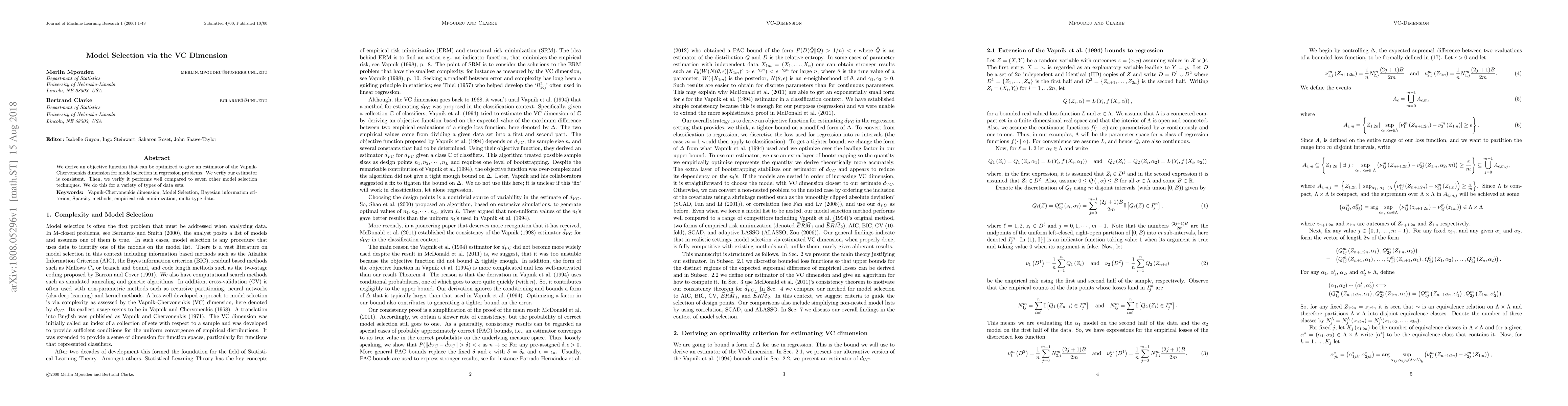 We derive an objective function that can be optimized to give an estimator of the Vapnik- Chervonenkis dimension for model selection in regression problems. We verify our estimator is consistent. Then, we verify it performs well compared to seven other model selection techniques. We do this for a variety of types of data sets.