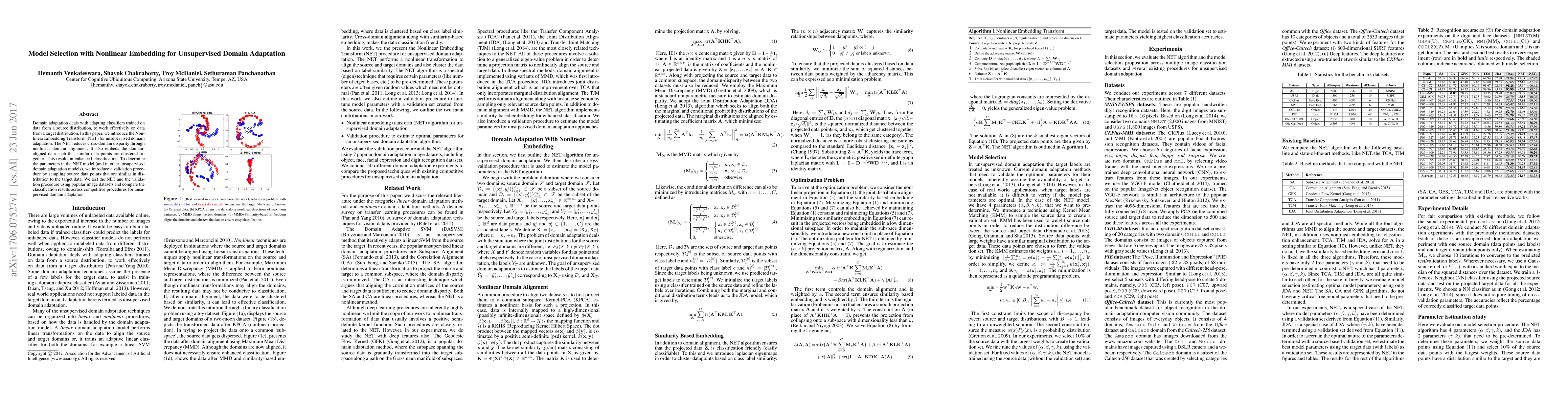 This paper proposes the Nonlinear Embedding Transform (NET) for unsupervised domain adaptation, which aligns domains nonlinearly and clusters similar data points for better classification. A validation procedure is introduced to determine NET parameters by sampling source data similar to the target distribution, tested on image datasets for comparative evaluation.