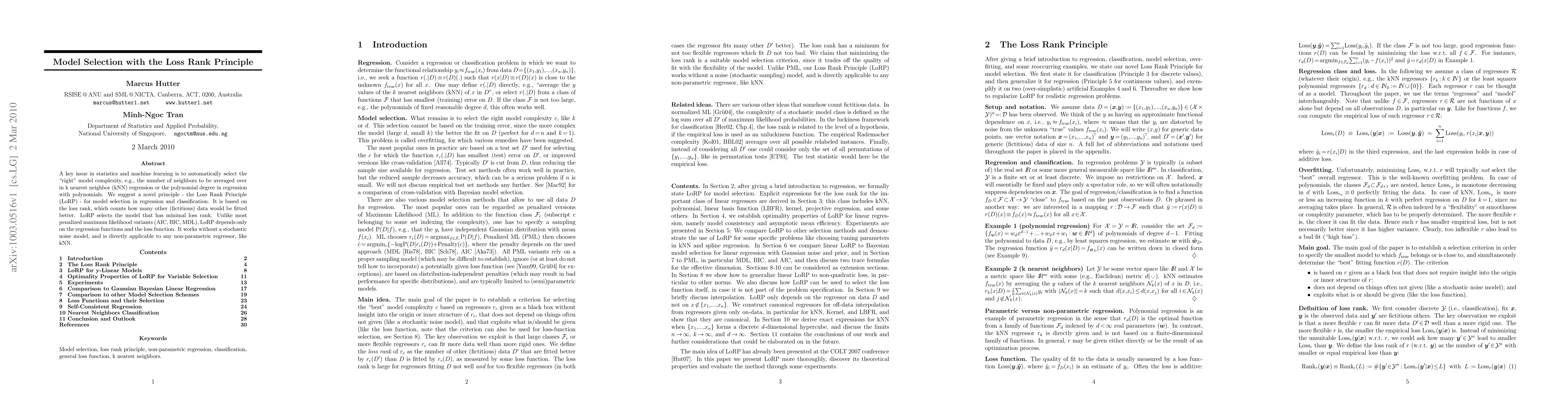 A key issue in statistics and machine learning is to automatically select the "right" model complexity, e.g., the number of neighbors to be averaged over in k nearest neighbor (kNN) regression or the polynomial degree in regression with polynomials. We suggest a novel principle - the Loss Rank Principle (LoRP) - for model selection in regression and classification. It is based on the loss rank, which counts how many other (fictitious) data would be fitted better. LoRP selects the model that has minimal loss rank. Unlike most penalized maximum likelihood variants (AIC, BIC, MDL), LoRP depends only on the regression functions and the loss function. It works without a stochastic noise model, and is directly applicable to any non-parametric regressor, like kNN.