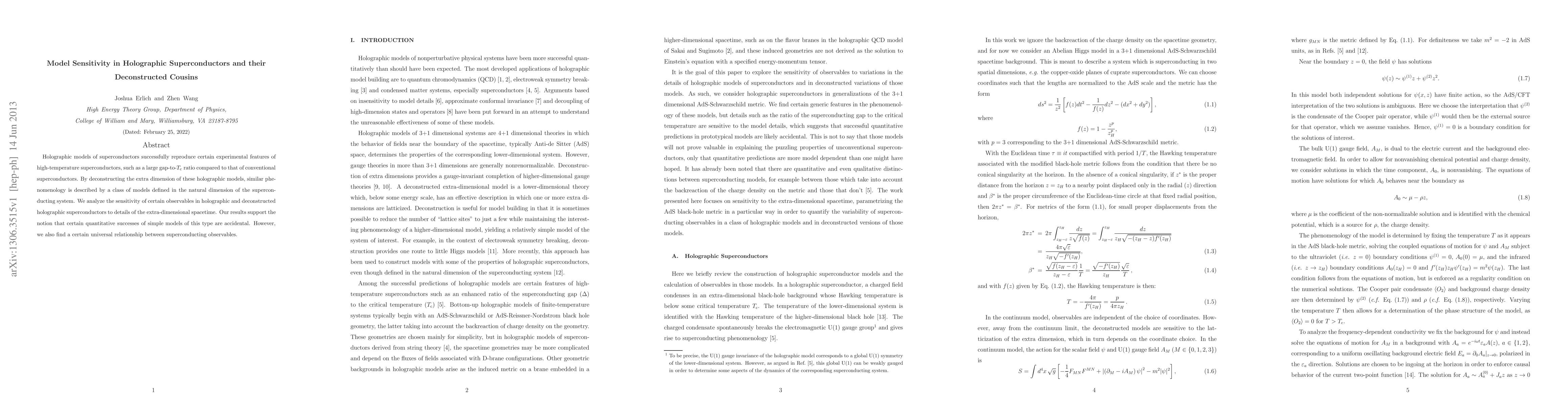 Holographic models of superconductors successfully reproduce certain experimental features of high-temperature superconductors, such as a large gap-to-T_c ratio compared to that of conventional superconductors. By deconstructing the extra dimension of these holographic models, similar phenomenology is described by a class of models defined in the natural dimension of the superconducting system. We analyze the sensitivity of certain observables in holographic and deconstructed holographic superconductors to details of the extra-dimensional spacetime. Our results support the notion that certain quantitative successes of simple models of this type are accidental. However, we also find a certain universal relationship between superconducting observables.