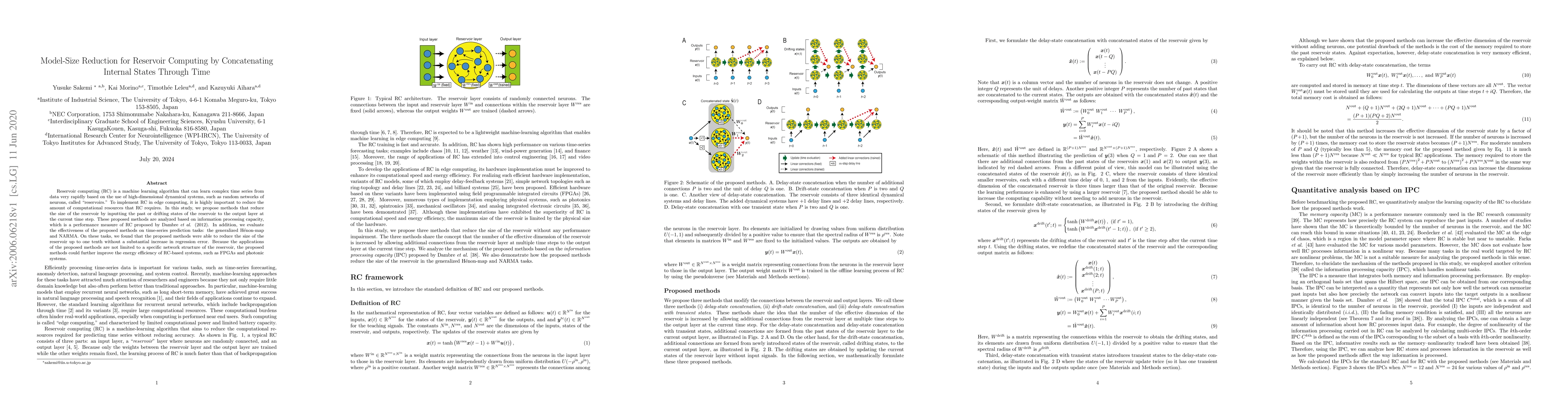 This paper proposes methods to reduce the size of reservoirs in reservoir computing by concatenating internal states over time, achieving up to a tenfold reduction without significant regression errors in time-series prediction tasks. The methods are shown to improve energy efficiency across various RC-based systems.