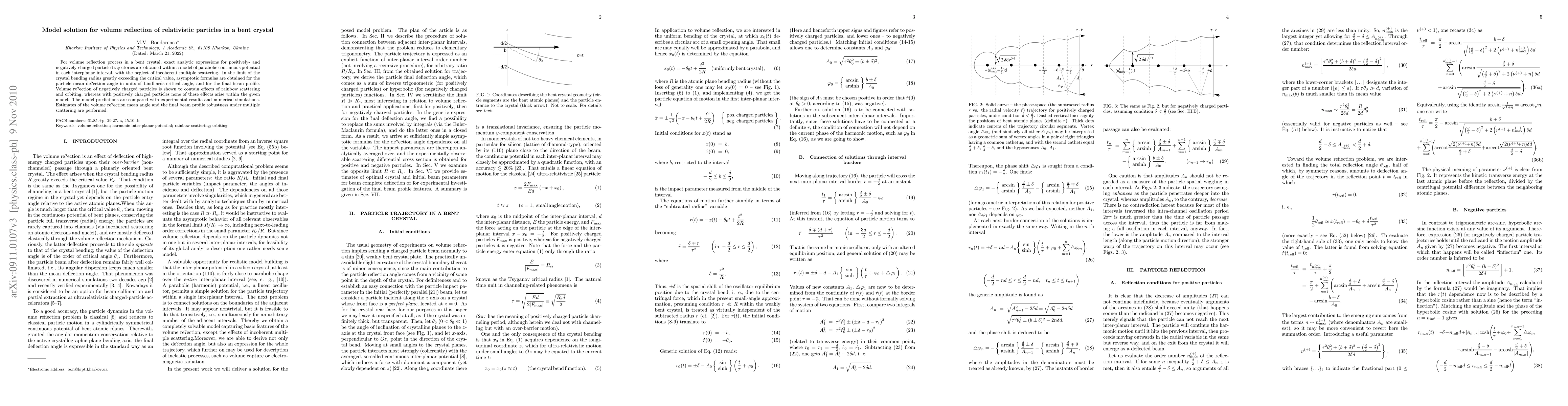 This paper derives exact analytic expressions for the trajectories of relativistic particles in a bent crystal, focusing on volume reflection. It highlights differences in scattering effects between positively and negatively charged particles, with the latter showing rainbow scattering and orbiting, and compares model predictions with experimental data and simulations.