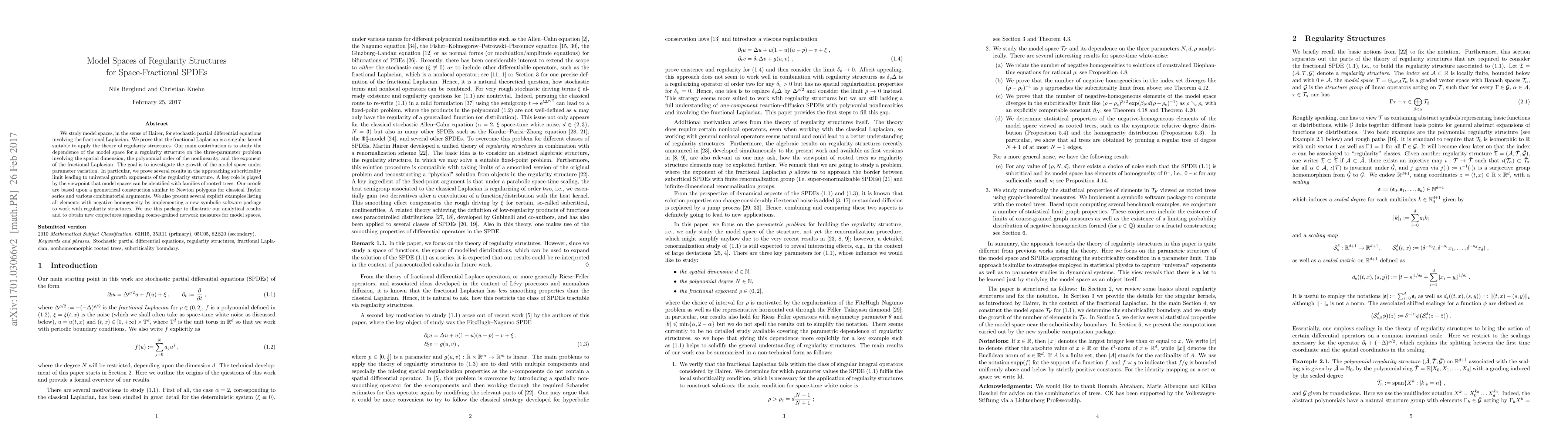 We study model spaces, in the sense of Hairer, for stochastic partial differential equations involving the fractional Laplacian. We prove that the fractional Laplacian is a singular kernel suitable to apply the theory of regularity structures. Our main contribution is to study the dependence of the model space for a regularity structure on the three-parameter problem involving the spatial dimension, the polynomial order of the nonlinearity, and the exponent of the fractional Laplacian. The goal is to investigate the growth of the model space under parameter variation. In particular, we prove several results in the approaching subcriticality limit leading to universal growth exponents of the regularity structure. A key role is played by the viewpoint that model spaces can be identified with families of rooted trees. Our proofs are based upon a geometrical construction similar to Newton polygons for classical Taylor series and various combinatorial arguments. We also present several explicit examples listing all elements with negative homogeneity by implementing a new symbolic software package to work with regularity structures. We use this package to illustrate our analytical results and to obtain new conjectures regarding coarse-grained network measures for model spaces.