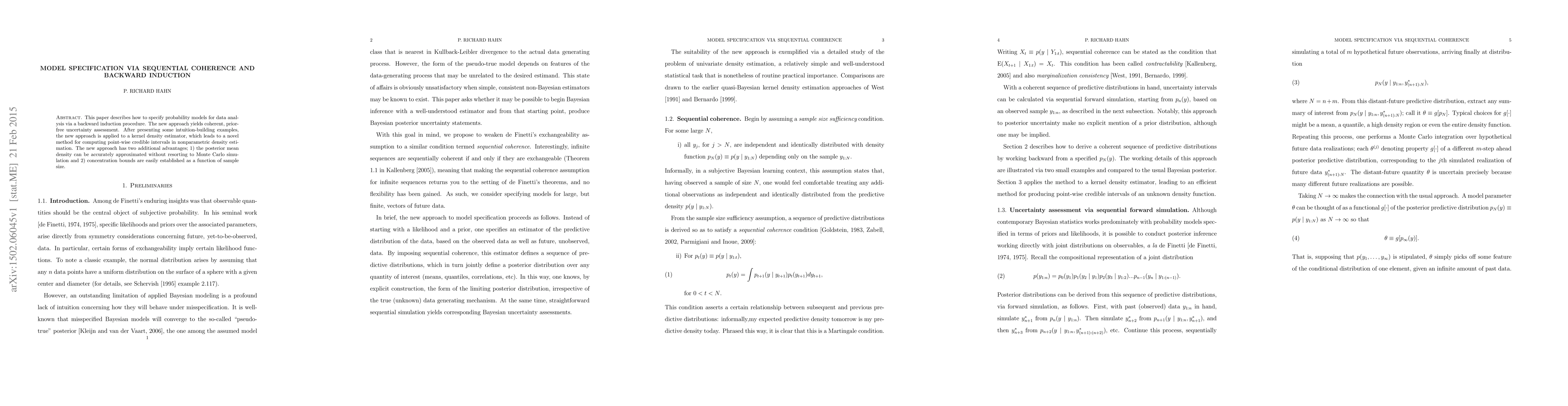 This paper describes how to specify probability models for data analysis via a backward induction procedure. The new approach yields coherent, prior-free uncertainty assessment. After presenting some intuition-building examples, the new approach is applied to a kernel density estimator, which leads to a novel method for computing point-wise credible intervals in nonparametric density estimation. The new approach has two additional advantages; 1) the posterior mean density can be accurately approximated without resorting to Monte Carlo simulation and 2) concentration bounds are easily established as a function of sample size.