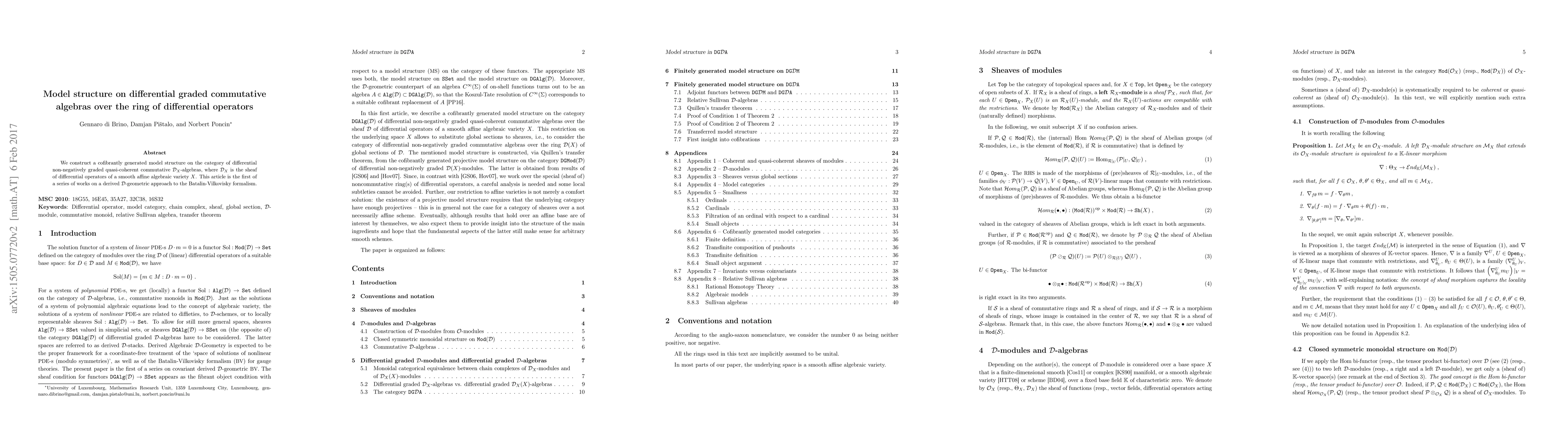 We construct a cofibrantly generated model structure on the category of differential non-negatively graded quasi-coherent commutative $D_X$-algebras, where $D_X$ is the sheaf of differential operators of a smooth afine algebraic variety X. The paper contains an extensive appendix on D-modules, sheaves versus global sections, some more technical model categorical issues, as well as on relative Sullivan algebras. This article is the first of a series of works -located at the interface of homotopical algebra, algebraic geometry, and mathematical physics - on a derived D-geometric approach to the BV-formalism.