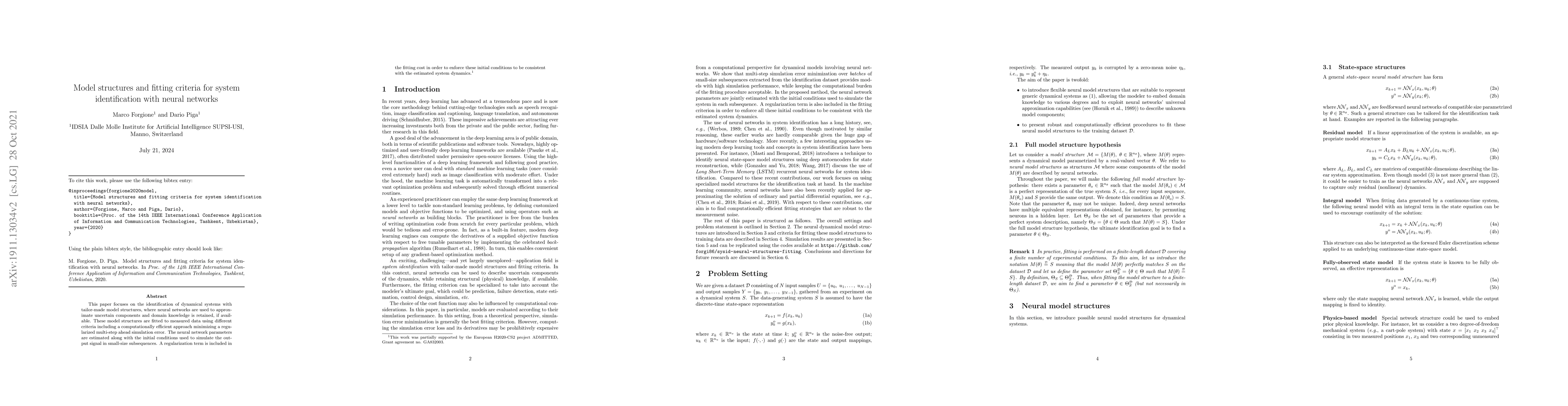 This paper explores the identification of dynamical systems using tailored neural network models that incorporate domain knowledge and minimize a regularized multi-step simulation error, addressing limitations of traditional prediction methods. The fitting process includes a regularization term to ensure consistency between initial conditions and system dynamics.