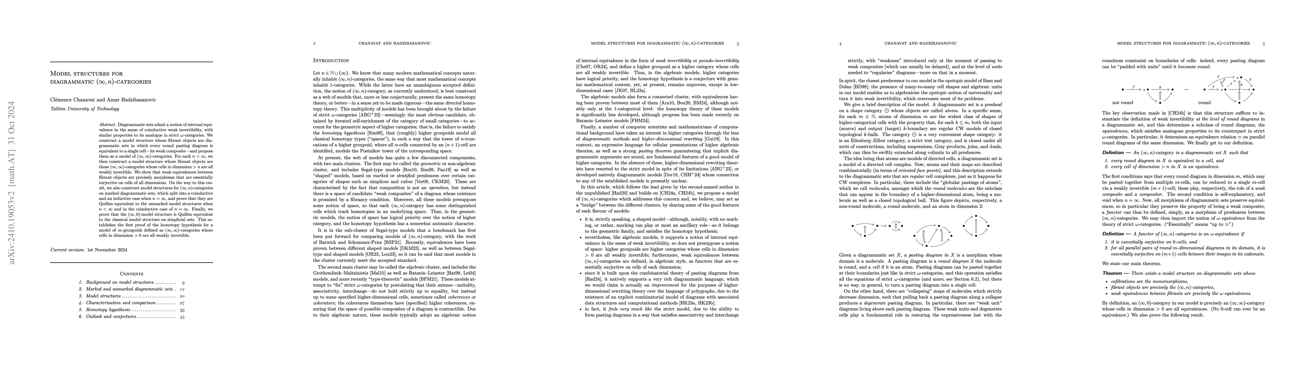 This paper introduces model structures for diagrammatic $(\infty, n)$-categories, establishing $(\infty, \infty)$-categories as equivalent to weakly composite round pasting diagrams. It also constructs model structures for $(\infty, n)$-categories and proves their Quillen equivalence to classical simplicial set models, confirming the homotopy hypothesis for $\infty$-groupoids.