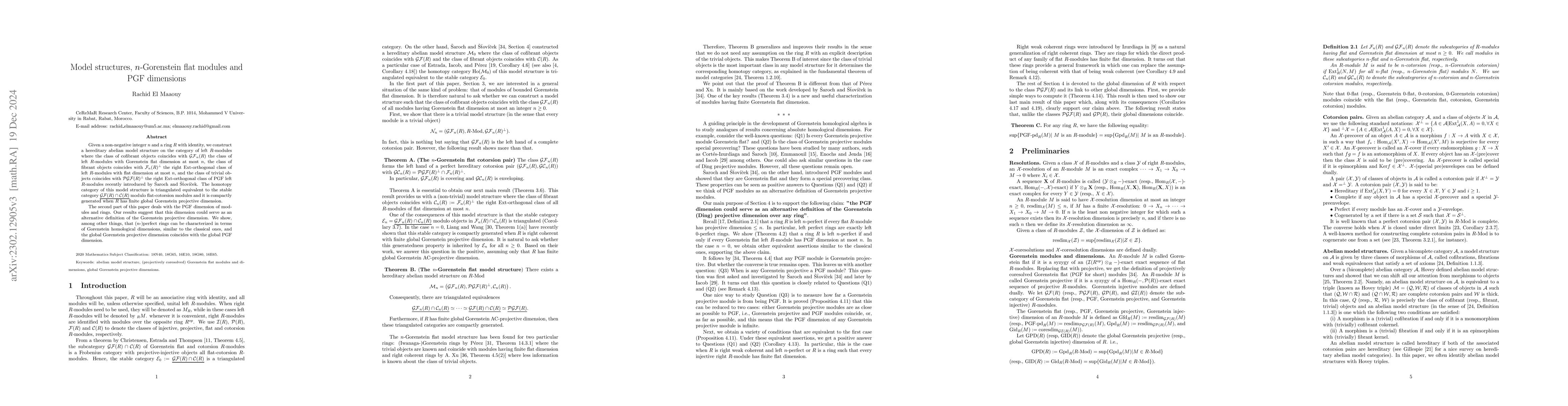 This paper constructs an abelian model structure on left $R$-modules, defining cofibrant, fibrant, and trivial objects in terms of Gorenstein flat, flat, and PGF dimensions. It demonstrates a triangulated equivalence between the homotopy category of this model structure and the stable category of Gorenstein flat modules modulo flat-cotorsion modules, and shows that the PGF dimension may serve as an alternative to the Gorenstein projective dimension.