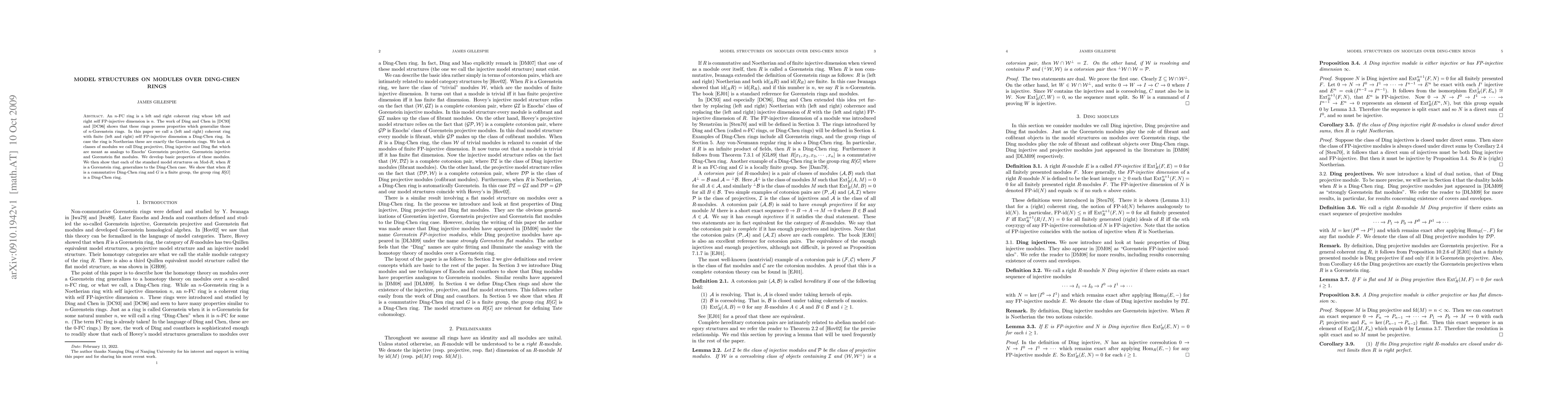 This paper investigates Ding-Chen rings, a class of coherent rings with finite self FP-injective dimension, and develops analogous Ding projective, Ding injective, and Ding flat module classes. It extends standard model structures from Gorenstein rings to Ding-Chen rings and proves that the group ring of a commutative Ding-Chen ring with a finite group remains a Ding-Chen ring.