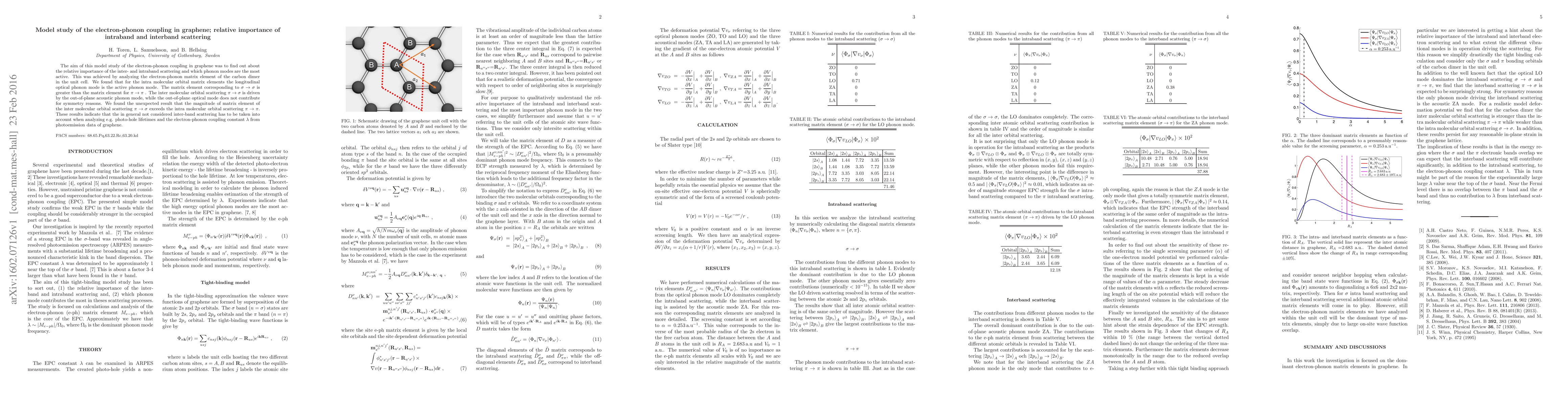 The aim of this model study of the electron-phonon coupling in graphene was to find out about the relative importance of the inter- and intraband scattering and which phonon modes are the most active. This was achieved by analyzing the electron-phonon matrix element of the carbon dimer in the unit cell. We found that for the intra molecular orbital matrix elements the longitudinal optical phonon mode is the active phonon mode. The matrix element corresponding to sigma to sigma is greater than the matrix element for pi to pi . The inter molecular orbital scattering pi to sigma is driven by the out-of-plane acoustic phonon mode, while the out-of-plane optical mode does not contribute for symmetry reasons. We found the unexpected result that the magnitude of matrix element of the inter molecular orbital scattering pi to sigmat exceeds the intra molecular orbital scattering pi to pi . These results indicate that the in general not considered inter-band scattering has to be taken into account when analyzing e.g. photo-hole lifetimes and the electron-phonon coupling constant ?from photoemission data of graphene.