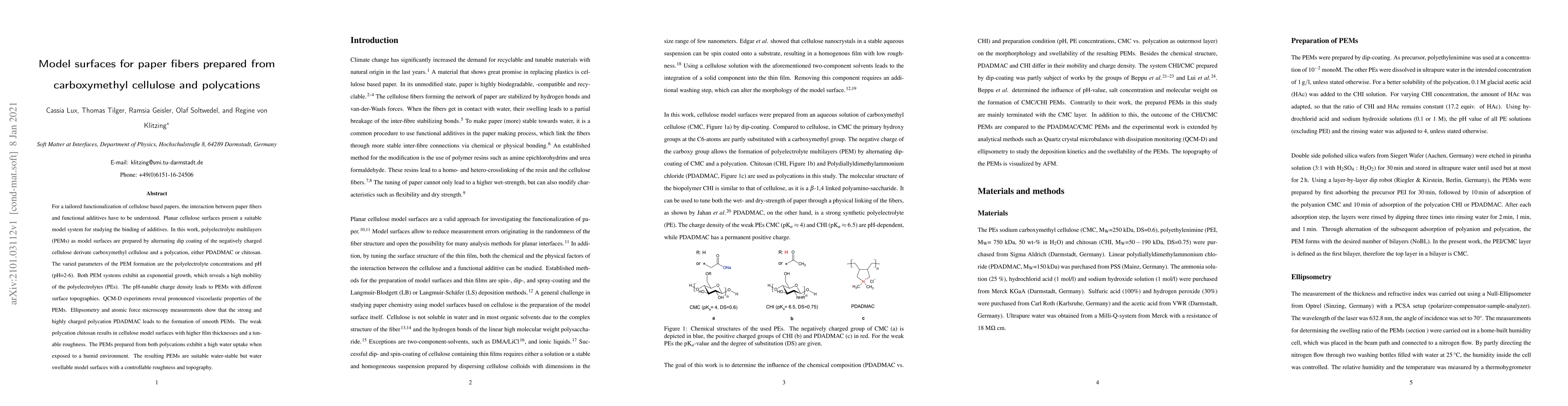 This study investigates the preparation of polyelectrolyte multilayers (PEMs) using carboxymethyl cellulose and polycations like PDADMAC or chitosan, revealing their tunable charge density and surface topography. The PEMs show high water uptake and are suitable as model surfaces for studying cellulose-based paper interactions.