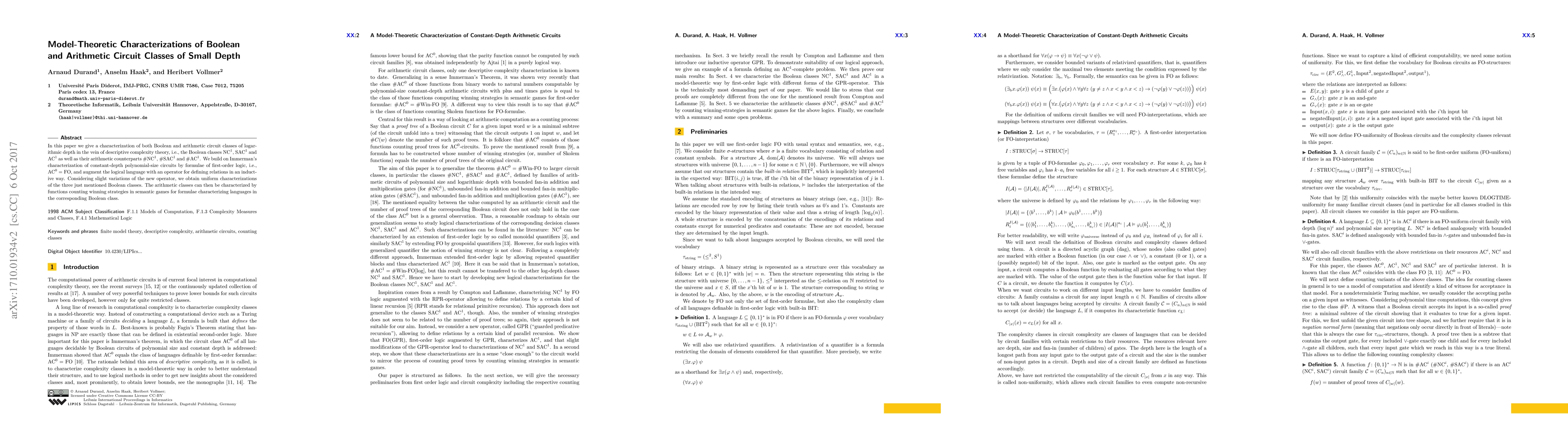 The paper presents the first logical characterizations of Boolean and arithmetic circuit classes of logarithmic depth beyond #AC0, using inductive operators in first-order logic to define relations.