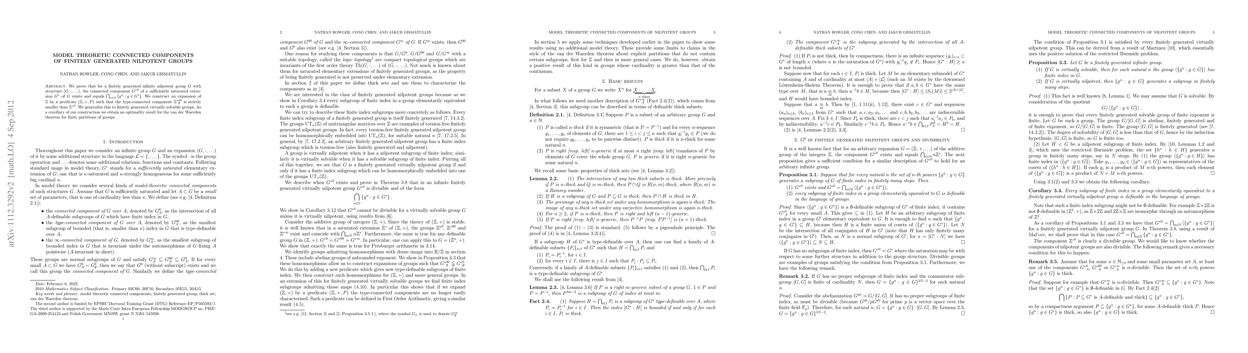 Researchers prove that connected components of finitely generated infinite nilpotent groups exist and can be described using a first-order formula, with implications for the van der Waerden theorem.