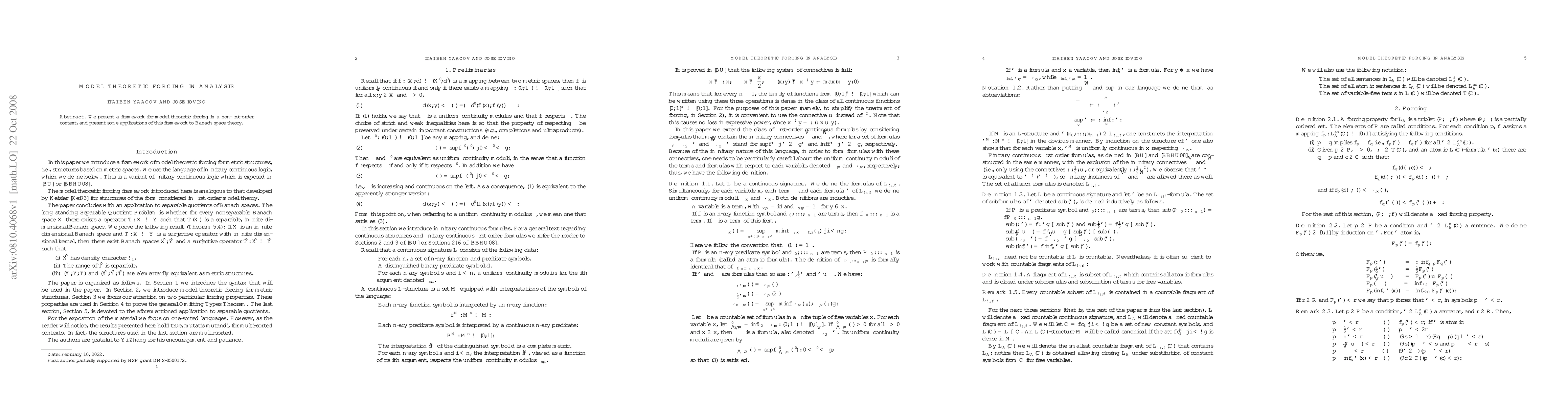 This paper introduces a framework for model theoretic forcing in analysis, enabling applications to Banach space theory, with key implications for understanding non-first-order contexts.