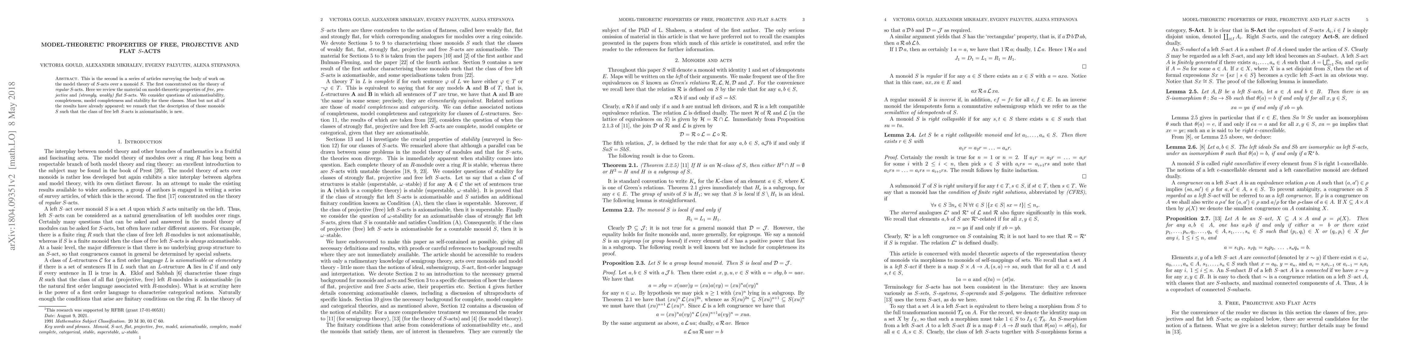This is the second in a series of articles surveying the body of work on the model theory of S-acts over a monoid S. The first concentrated on the theory of regular S-acts. Here we review the material on model-theoretic properties of free, projective, and (strongly, weakly) flat S-acts. We consider questions of axiomatizability, completeness, model completeness, and stability for these classes. Most but not all of the results have already appeared; we remark that the description of those monoids S such that the class of free left S-acts is axiomatizable, is new.
