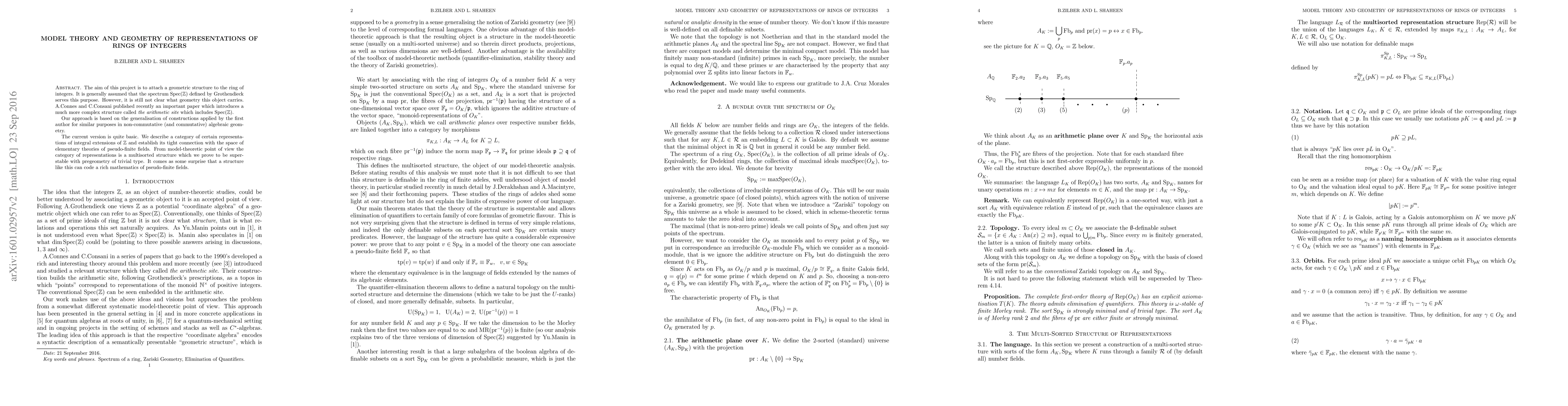 The aim of this project is to attach a geometric structure to the ring of integers. It is generally assumed that the spectrum $\mathrm{Spec}(\mathbb{Z})$ defined by Grothendieck serves this purpose. However, it is still not clear what geometry this object carries. A.Connes and C.Consani published recently an important paper which introduces a much more complex structure called {\em the arithmetic site} which includes $\mathrm{Spec}(\mathbb{Z}).$ Our approach is based on the generalisation of constructions applied by the first author for similar purposes in non-commutative (and commutative) algebraic geometry. The current version is quite basic. We describe a category of certain representations of integral extensions of $\Z$ and establish its tight connection with the space of elementary theories of pseudo-finite fields. From model-theoretic point of view the category of representations is a multisorted structure which we prove to be superstable with pregeometry of trivial type. It comes as some surprise that a structure like this can code a rich mathematics of pseudo-finite fields.