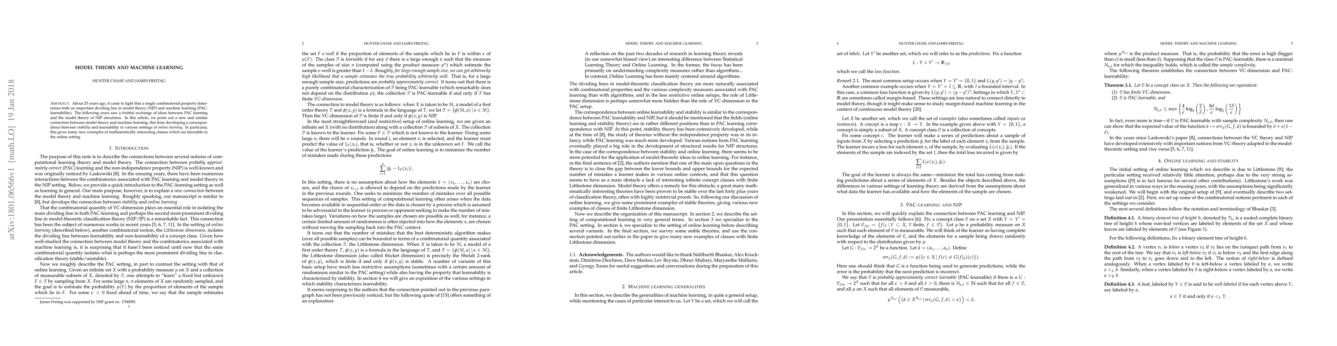Researchers uncover a new connection between model theory and machine learning, finding that stability in online learning is equivalent to learnability, leading to new examples of interesting classes that can be learned in the online setting.