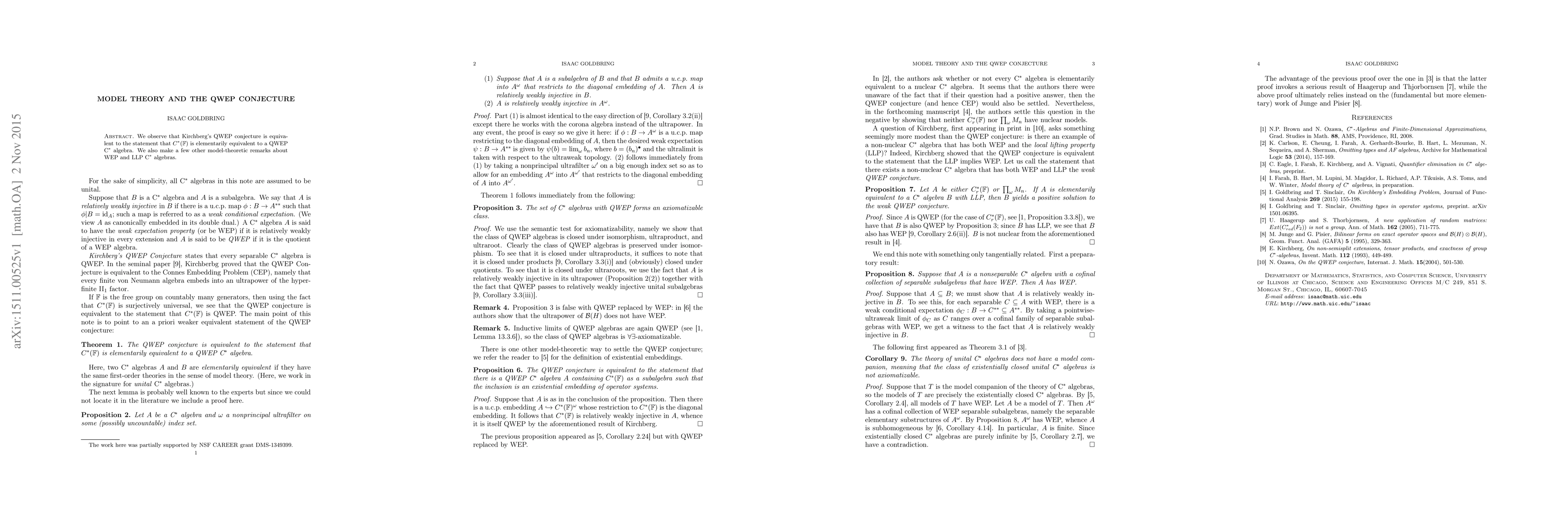 This paper shows that Kirchberg's QWEP conjecture is equivalent to a specific model-theoretic statement about C* algebras, and makes observations about the relationships between certain classes of C* algebras.