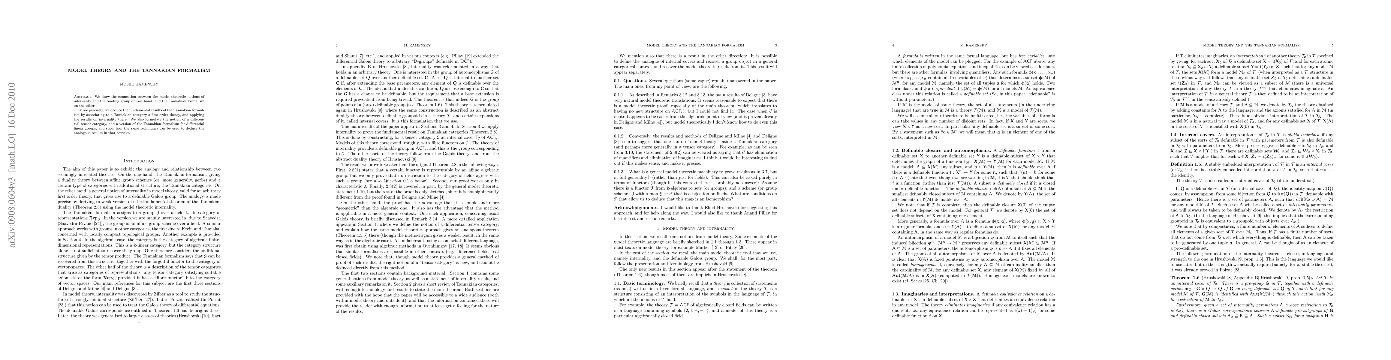 We draw the connection between the model theoretic notions of internality and the binding group on one hand, and the Tannakian formalism on the other. More precisely, we deduce the fundamental results of the Tannakian formalism by associating to a Tannakian category a first order theory, and applying the results on internality there. We also formulate the notion of a differential tensor category, and a version of the Tannakian formalism for differential linear groups, and show how the same techniques can be used to deduce the analogous results in that context.