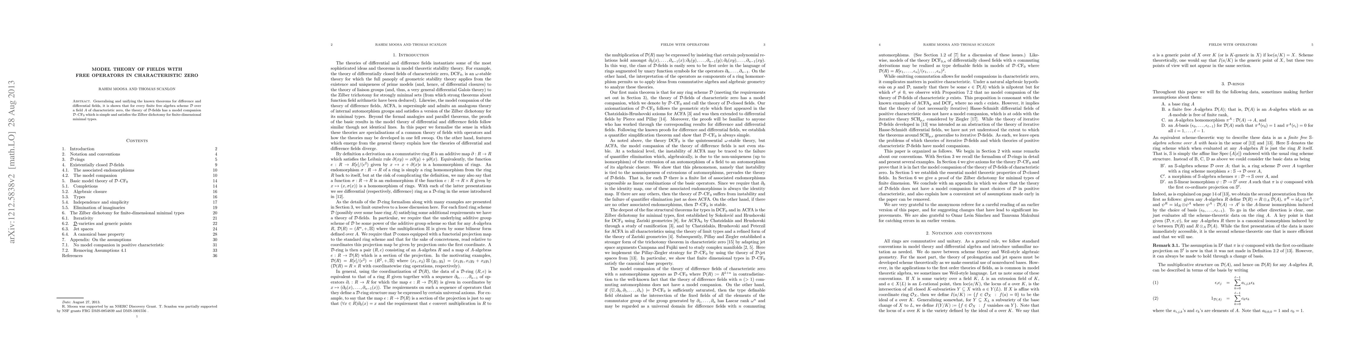 This paper generalises theorems for difference and differential fields to fields with free operators in characteristic zero, establishing a model companion ${\mathcal D}$-CF$_0$ for any finite free ${\mathbb S}$-algebra ${\mathcal D}$ over such a field, which is simple and adheres to the Zilber dichotomy for finite-dimensional minimal types.