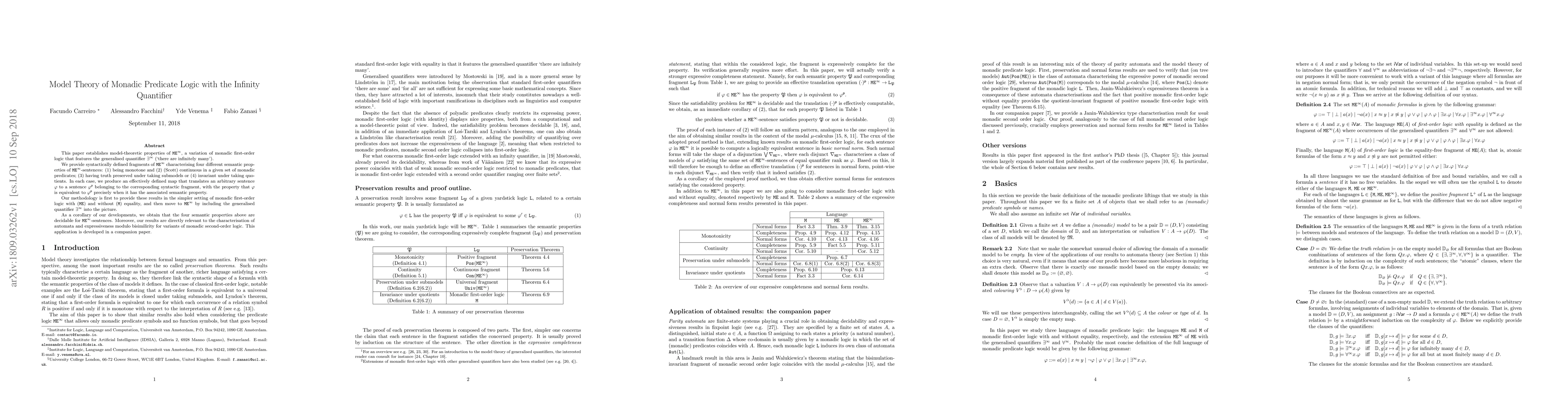 This paper investigates model-theoretic properties of monadic first-order logic with the infinity quantifier $\exists^\infty$, establishing syntactic fragments for four semantic properties: monotonicity, continuity, submodel preservation, and quotient invariance. The results are shown to be decidable and relevant to automata and expressiveness in related logics.