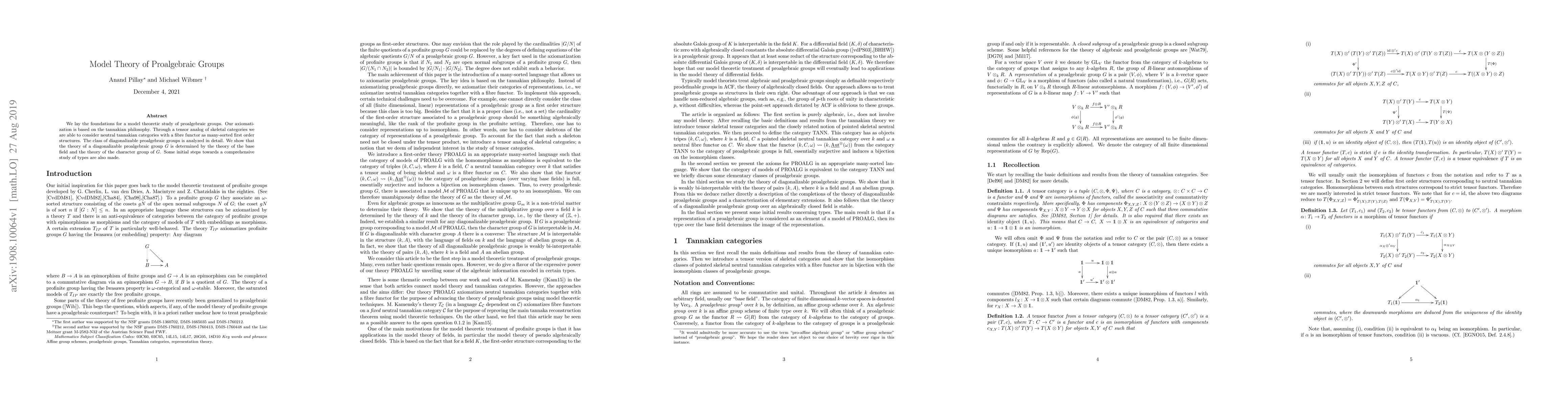 We lay the foundations for a model theoretic study of proalgebraic groups. Our axiomatization is based on the tannakian philosophy. Through a tensor analog of skeletal categories we are able to consider neutral tannakian categories with a fibre functor as many-sorted first order structures. The class of diagonalizable proalgebraic groups is analyzed in detail. We show that the theory of a diagonalizable proalgebraic group $G$ is determined by the theory of the base field and the theory of the character group of $G$. Some initial steps towards a comprehensive study of types are also made.