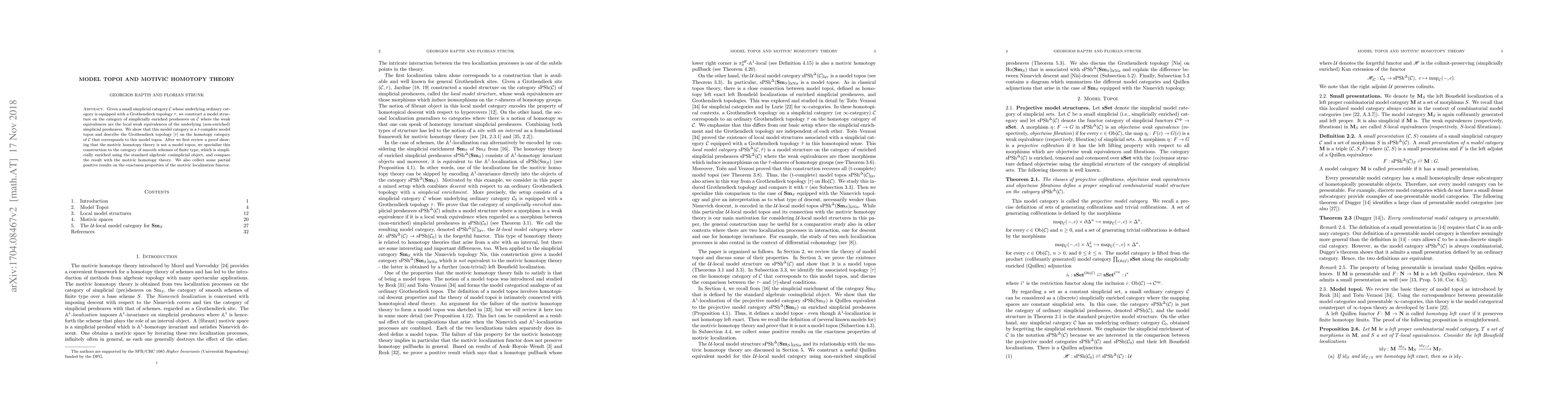 This paper constructs a model structure on simplicially enriched presheaves over a small simplicial category with a Grothendieck topology, establishing it as a $t$-complete model topos. It contrasts this with motivic homotopy theory, showing that the latter does not fit this model topos framework, and discusses its exactness properties.