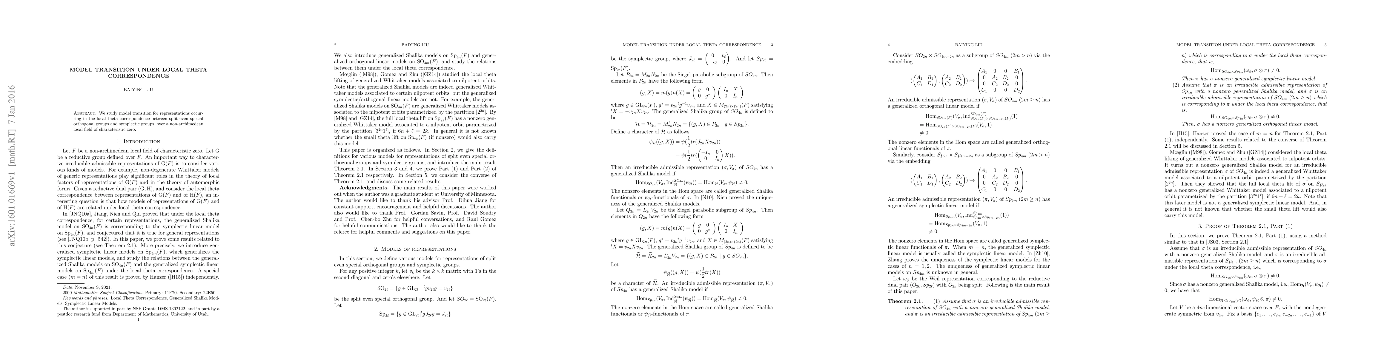 Summary: The paper investigates the model transition for representations involved in the local theta correspondence linking split even special orthogonal and symplectic groups over a non-archimedean local field of characteristic zero.