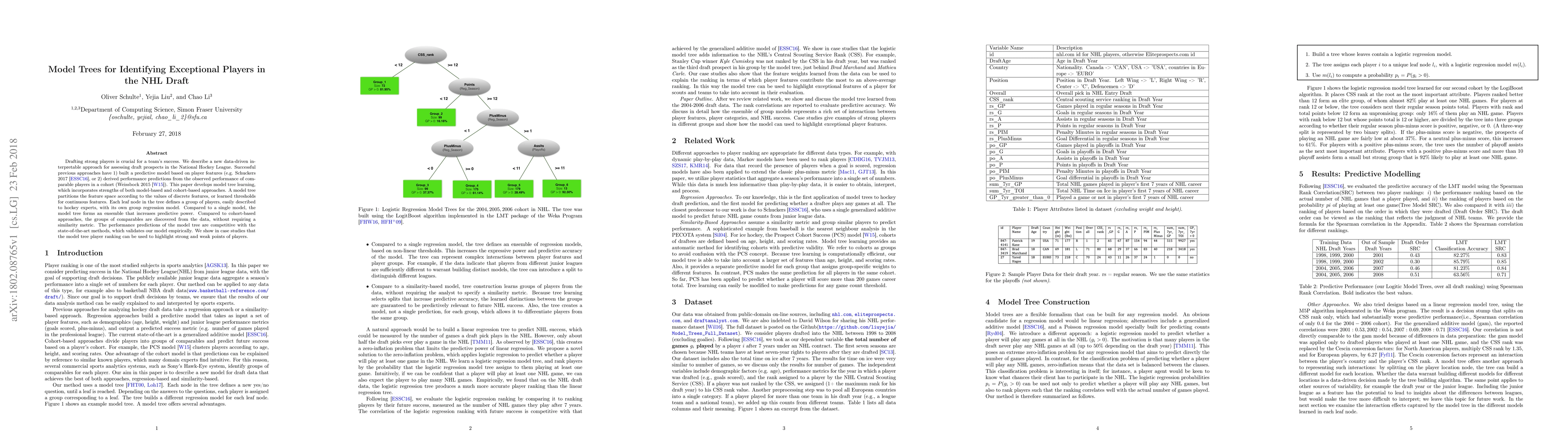 Drafting strong players is crucial for the team success. We describe a new data-driven interpretable approach for assessing draft prospects in the National Hockey League. Successful previous approaches have built a predictive model based on player features, or derived performance predictions from the observed performance of comparable players in a cohort. This paper develops model tree learning, which incorporates strengths of both model-based and cohort-based approaches. A model tree partitions the feature space according to the values of discrete features, or learned thresholds for continuous features. Each leaf node in the tree defines a group of players, easily described to hockey experts, with its own group regression model. Compared to a single model, the model tree forms an ensemble that increases predictive power. Compared to cohort-based approaches, the groups of comparables are discovered from the data, without requiring a similarity metric. The performance predictions of the model tree are competitive with the state-of-the-art methods, which validates our model empirically. We show in case studies that the model tree player ranking can be used to highlight strong and weak points of players.